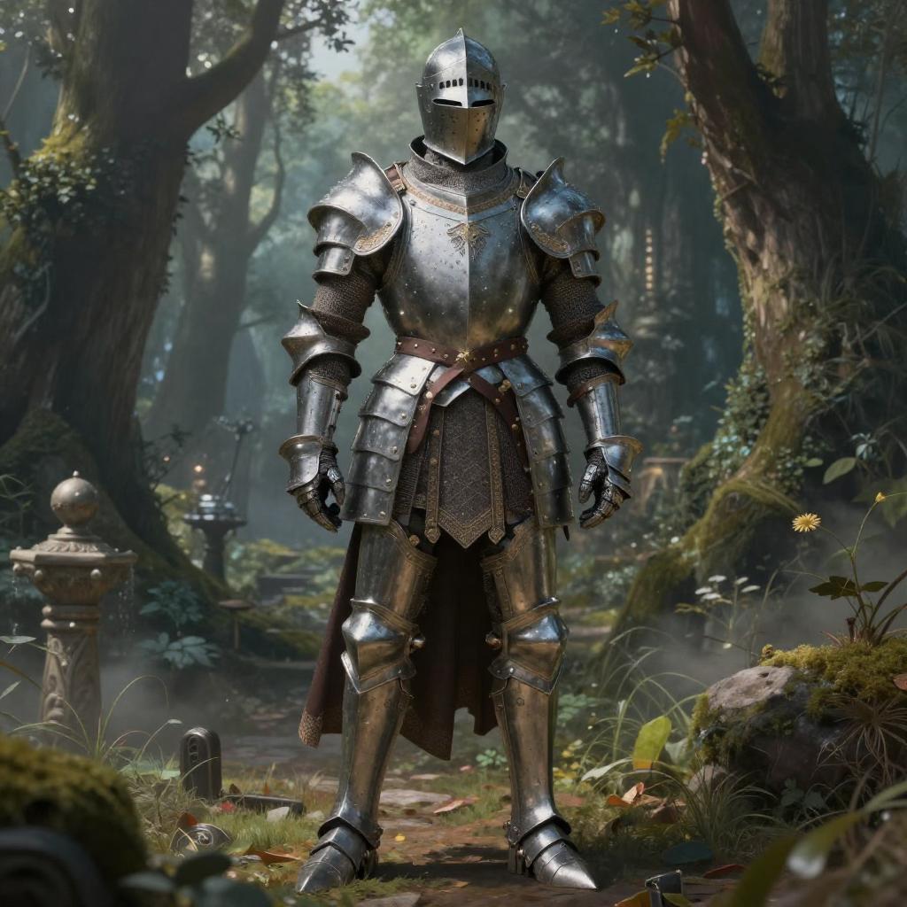 A photorealistic full-body depiction of an ancient knight clad in detailed shining medieval armor standing in a misty enchanted forest clearing. The scene features cinematic lighting highlighting the intricate armor details, surrounded by lush foliage and tall trees, evoking a fantasy atmosphere. The image resembles a majestic oil painting with high detail and sharp focus.