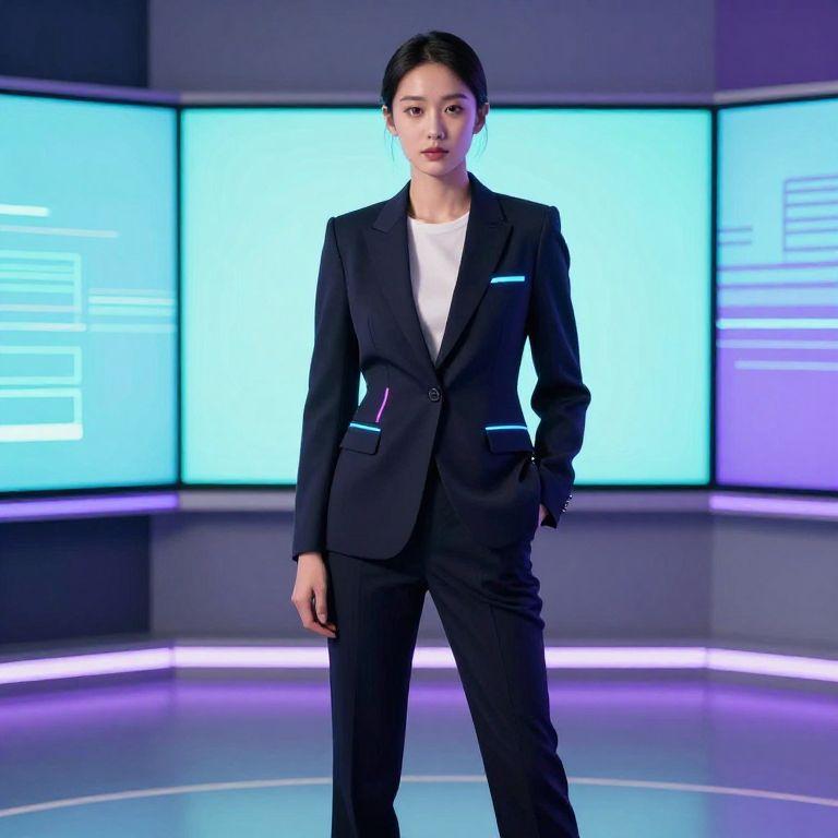 Prompt suit designed for creative professionals, featuring sleek lines, neon accents, and a minimalist tech vibe, set in a modern urban studio with glowing screens and abstract digital patterns in soft cyan and purple.