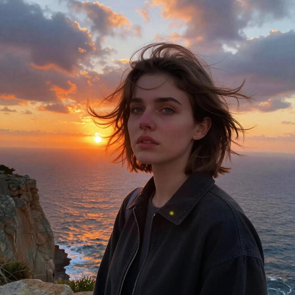 Girl with gray eyes and short hair, standing on a cliff overlooking the ocean at sunset, dramatic sky, wind blowing, realistic style, emotional expression, vivid colors