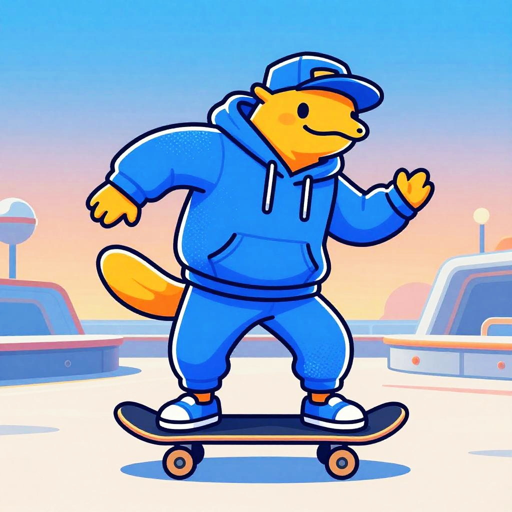 Realistic photo. A vibrant cartoon illustration of a luminescent platypus breakdancer at in futuristic skate plaza, bold black outlines, clean cel shading, crisp cutout edges; oversized hoodie, tapered joggers, slip-on shoes, cap and wristbands. Relaxed, expressive pose, confident tilt, exaggerated proportions, chunky silhouette; modern, slightly abstract shapes, minimal clutter; simple gradient backdrop, tidy shadows, soft rim light. Dominant electric blue and glowing orange with high-contrast accents; playful retro hip-hop vibe, halftone speckles, subtle paper grain.