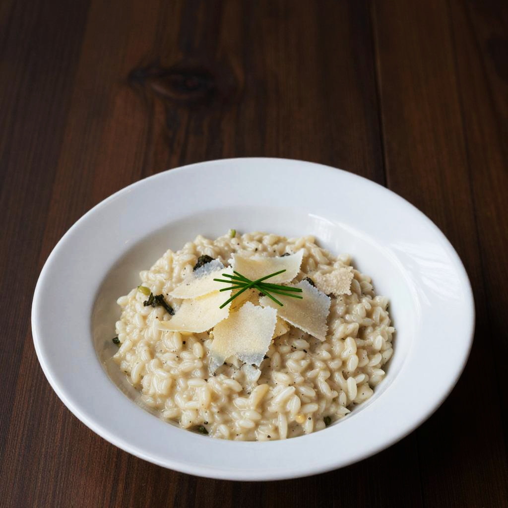 Top-down photo of a white porcelain bowl with creamy risotto, shaved parmesan, and chive sprigs, on dark wood, moody premium lighting, professional food photography, empty space for text in the corner