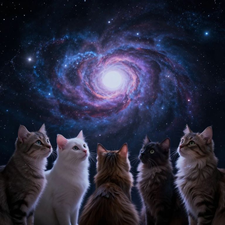 Five cats, their eyes fixed on the cosmic abyss, embody a collective contemplation of the infinite—where gravity whispers secrets of existence, and the shape of fear dissolves into the boundless expanse of wonder.