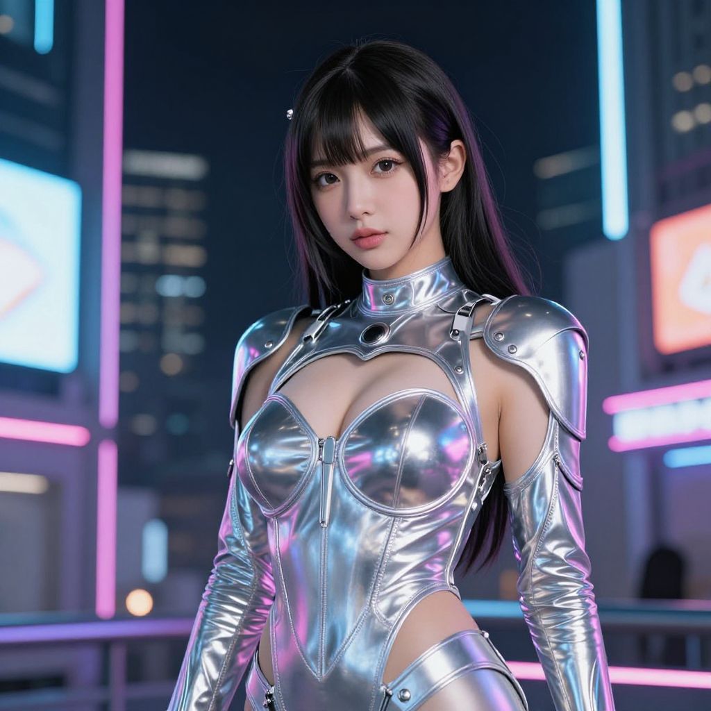 Photorealistic digital artwork of an East Asian woman with long black hair and fair skin, wearing a shiny, silver metallic bodysuit with cutouts revealing ample cleavage and shoulder armor. Her outfit has long sleeves that match the bodysuit. She stands in a futuristic, neon-lit cityscape at night, with blurred skyscrapers and colorful LED lights in the background. Her expression is neutral, and she gazes directly at the camera. The image has a cyberpunk aesthetic, with vibrant, glowing neon colors and a high-tech, urban environment.