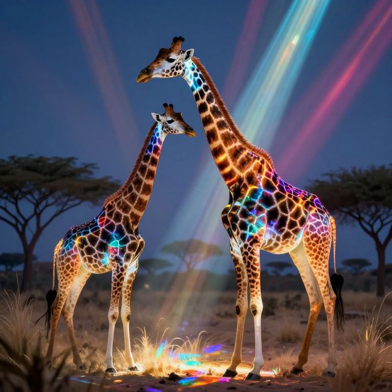 Giraffes adorned with luminous, prismatic patterns stride through a kaleidoscopic realm where beams of light and color weave around them, casting shimmering reflections that blur the line between reality and illusion.