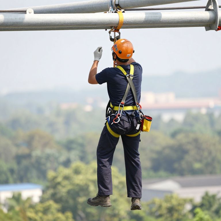 A worker wearing a full-body safety harness while inspecting a tall structure, with a clear view of the harness's attachment points and the surrounding environment.