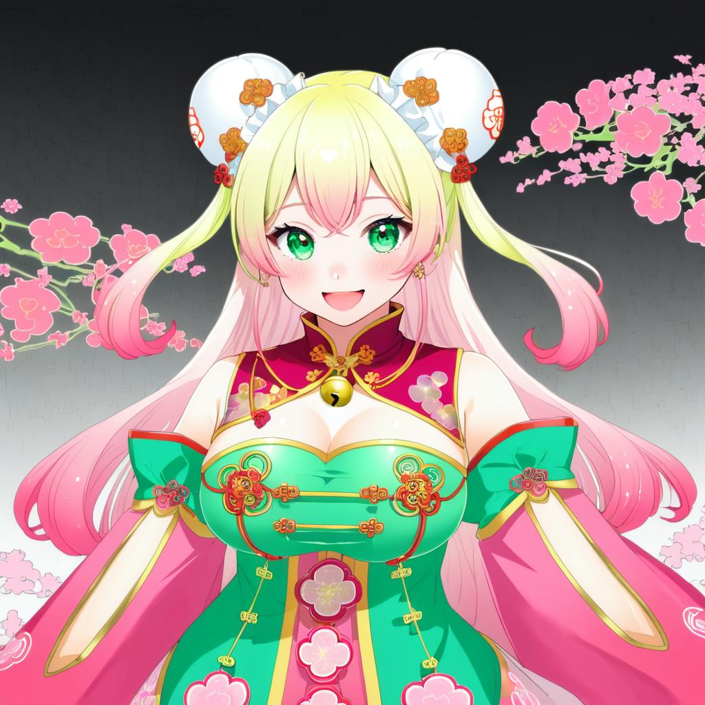Momosuzu nene (old design), hololive, 1girl, fang, green eyes, hair between eyes, blonde hair, long hair, gradient hair, pink hair, double bun, two side up, hair flower, bun cover, medium breasts, large breasts, chinese clothes, chinese clothes, detached sleeves, juliet sleeves, virtual youtuber, virtual youtuber, jingle bell, by artist yagisaka seto, anime