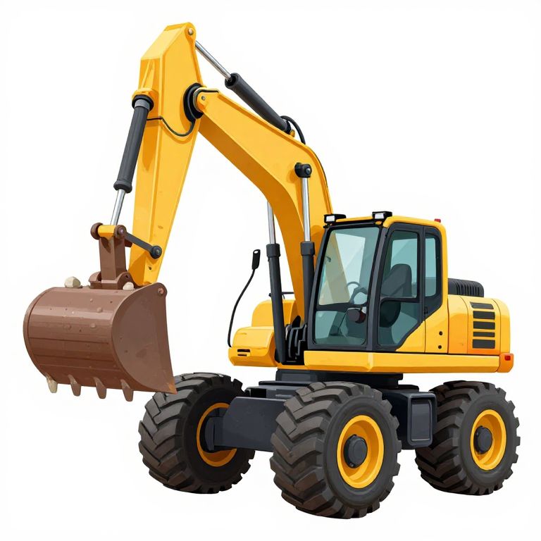 A vibrant cartoon-style illustration of a yellow construction digger with large black tires and a brown scoop filled with rocks, rendered in a clean, digital art medium with bold outlines and bright colors, showcasing a playful yet detailed depiction of heavy machinery.