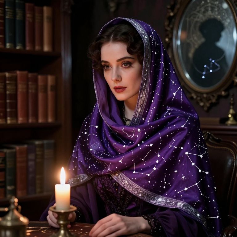 A cinematic, high-detail photograph of a 1930s fortune teller in a dimly lit, gothic-style parlor, wearing a flowing, intricately woven headscarf in deep purple and silver, with tiny constellations woven into the fabric, her face illuminated by a single candle with a soft glow, her expression serene and enigmatic, the background shows old bookshelves with leather-bound astrology books, a mirror reflecting her silhouette with faint mystical patterns floating in the air.