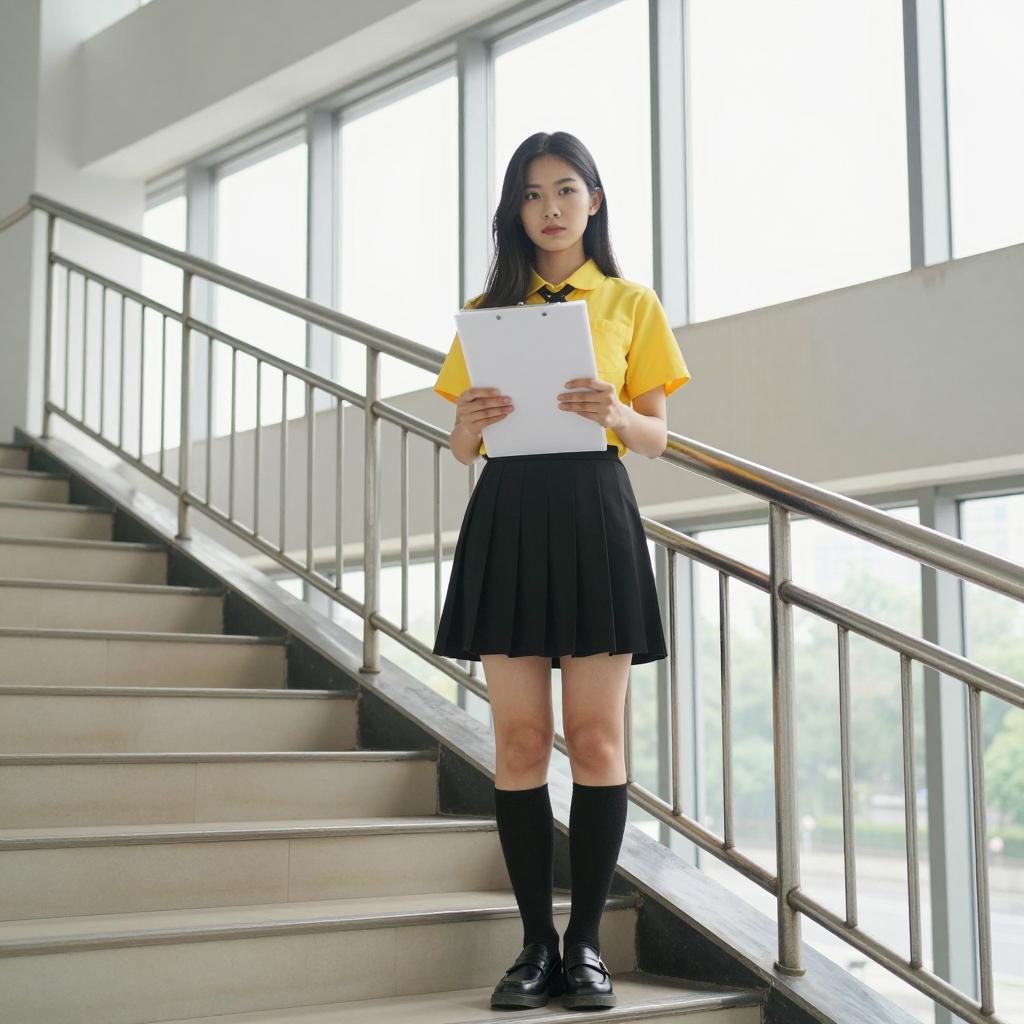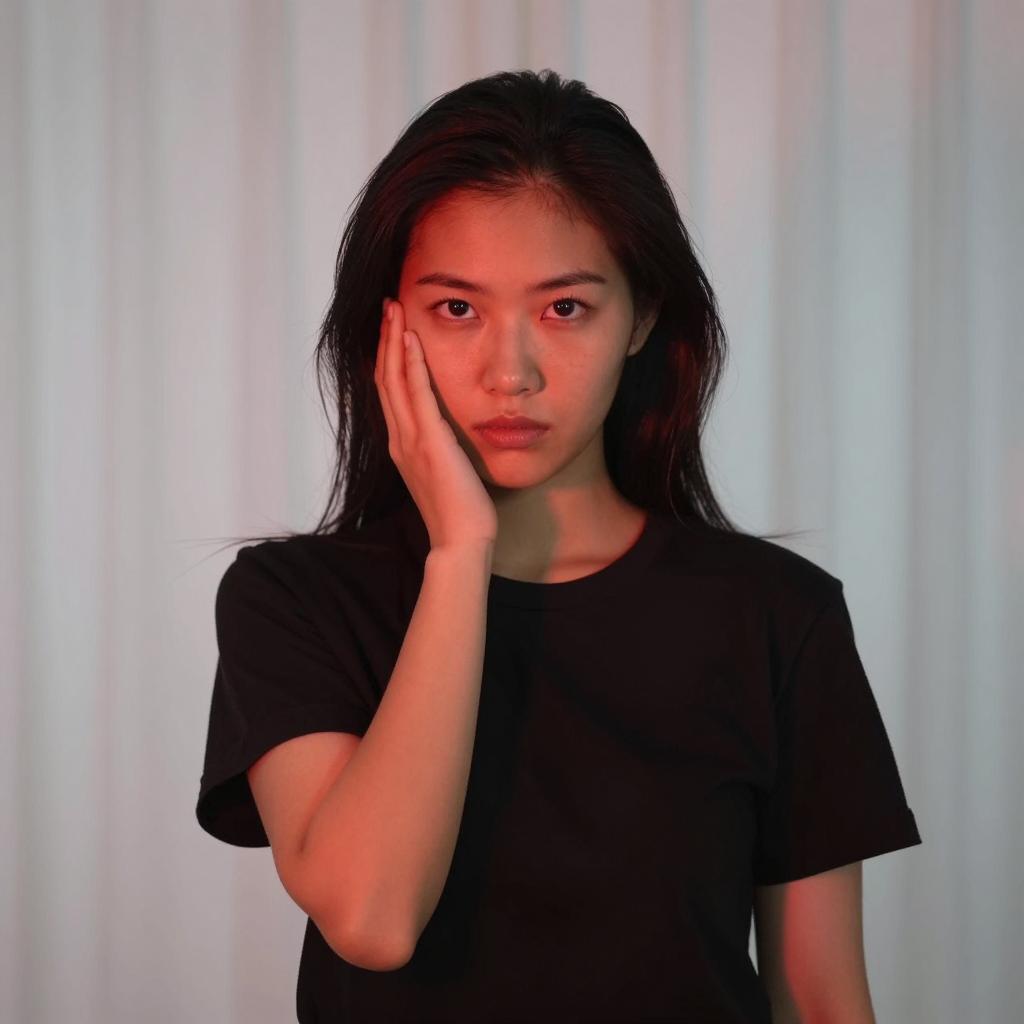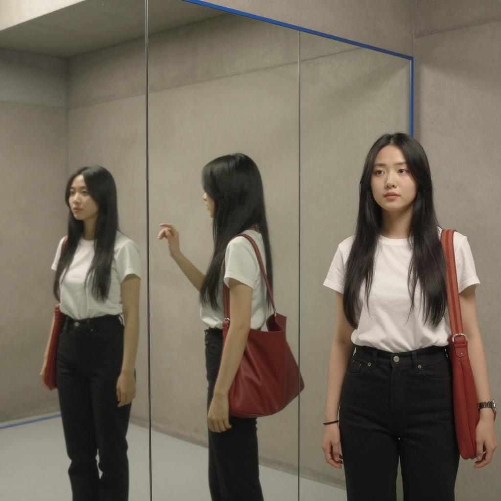Young woman with long black hair, white short-sleeved shirt, black pants, and red striped bag, reflected in multiple mirrors. Blue wire frame around mirrors. She stands to the right, looking forward, with arms slightly raised. Concrete ceiling and beige walls in the background. Three reflections of her visible. Medium shot. Neutral facial expression. Indoor setting.