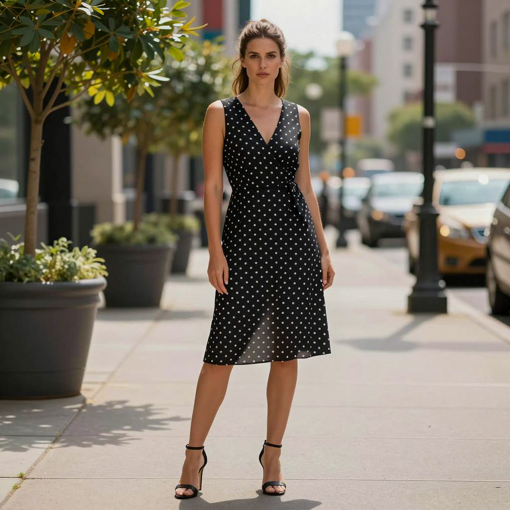Woman in a red polka dot dress with a deep V-neck and thigh-high slit. She has long brown hair, wears black sunglasses, and a red crossbody bag. She stands against a stone wall with a black iron gate, wearing black and white striped shoes. Sunlight illuminates her.