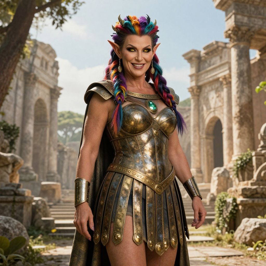Digital fantasy artwork of a muscular, smiling, elfish woman with rainbow hair, golden armor, and a gemstone necklace, standing in a sunlit