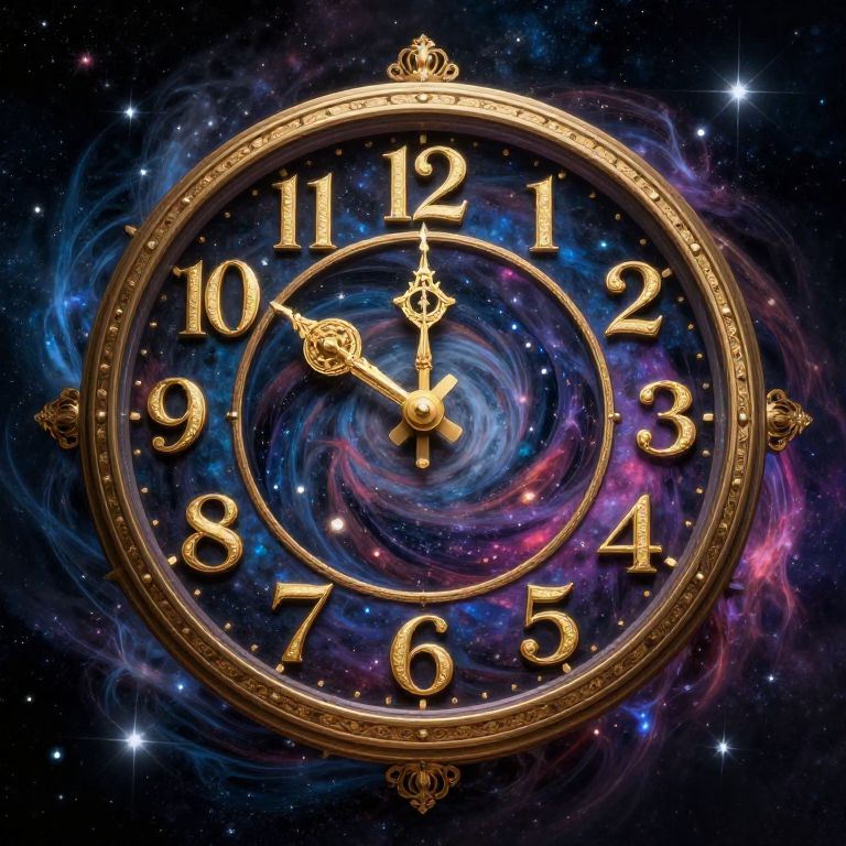 A grand clock with twelve ornate golden numbers, surrounded by swirling galaxy stars and cosmic dust, set against a deep space background, blending steampunk and cosmic fantasy styles, vibrant colors, high resolution