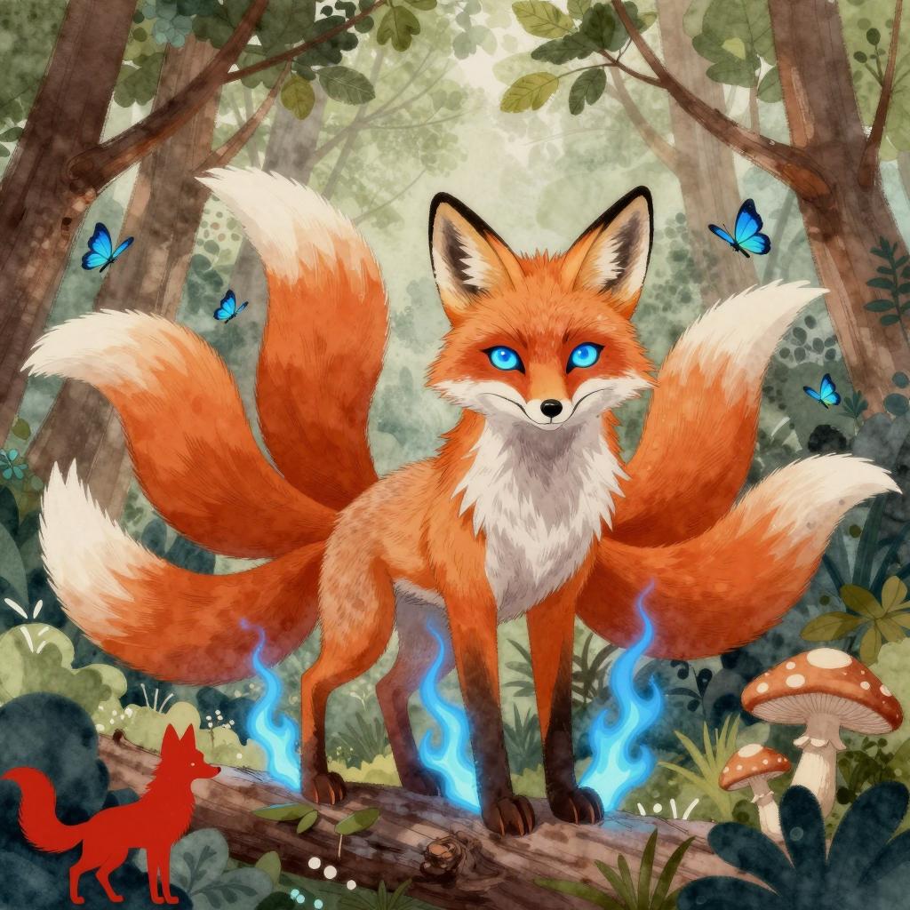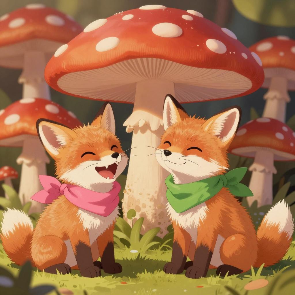 Illustration of two fox kittens sitting under large red and white spotted mushrooms. The left kitten has a pink scarf, open mouth, and sharp teeth. The right kitten has a green scarf, closed eye, and relaxed expression. Mushrooms fill the background. Both kittens have light brown and white fur. The right kitten's paw is raised slightly. The artist's is in the bottom right corner.