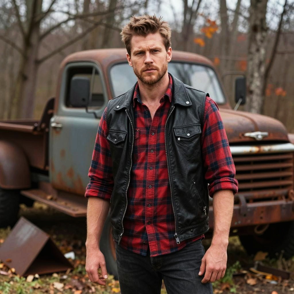 A rugged Caucasian man with short, tousled hair and a beard stands confidently in a rustic outdoor setting. He wears a black leather vest over a red plaid flannel shirt with rolled-up sleeves and dark jeans. Behind him is an old, rusty vintage truck surrounded by scattered metal debris, framed by bare trees in an autumn forest.