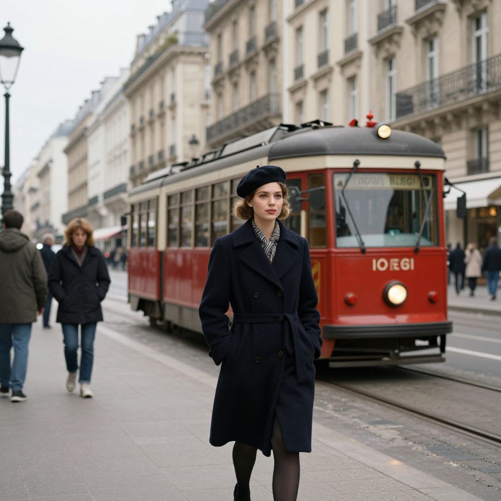 Vintage Parisian street scene featuring a woman in a dark coat and beret walking confidently toward the camera, with a classic red tram labeled \"10010S ILEGI\" passing behind her, surrounded by historic buildings and pedestrians in a bustling urban setting.