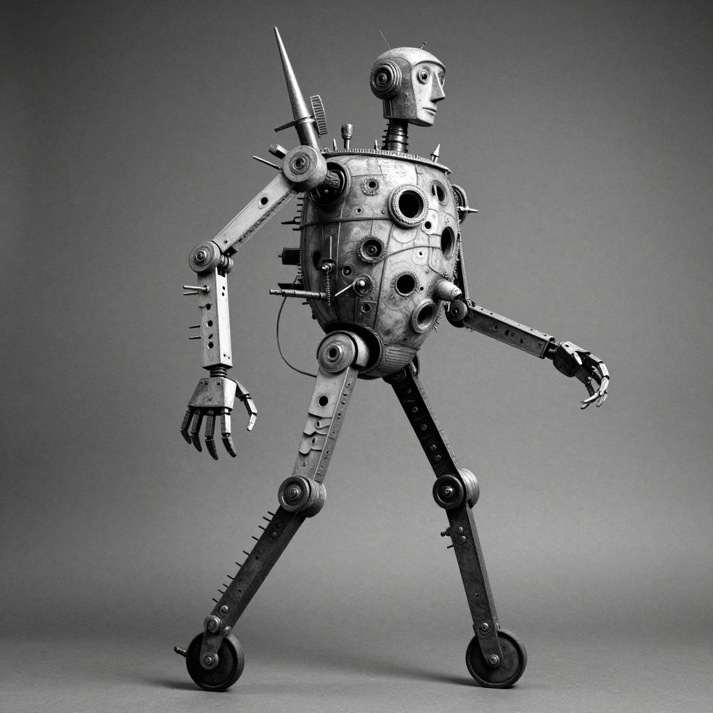The image depicts a lanky Dada walking machine, an awkward iron robot pedestrian with attenuated stilt legs and a tubby torso. The motion machinery is over-complicated, featuring strange protuberances and spikes, as well as numerous holes and intricate details. The machine is in the style of Marcel Duchamp, Man Ray, Otto Dix, Jean Tinguely, and Hans Bellmer, with a 8k resolution, volumetric lighting, and monochrome black and white color scheme. The texture is super fine grain, and the focus is super sharp. The overall composition is complex, with elements arranged in a dynamic and intricate manner, reflecting the Dada aesthetic of anti-art and the mechanical nature of the machine.
