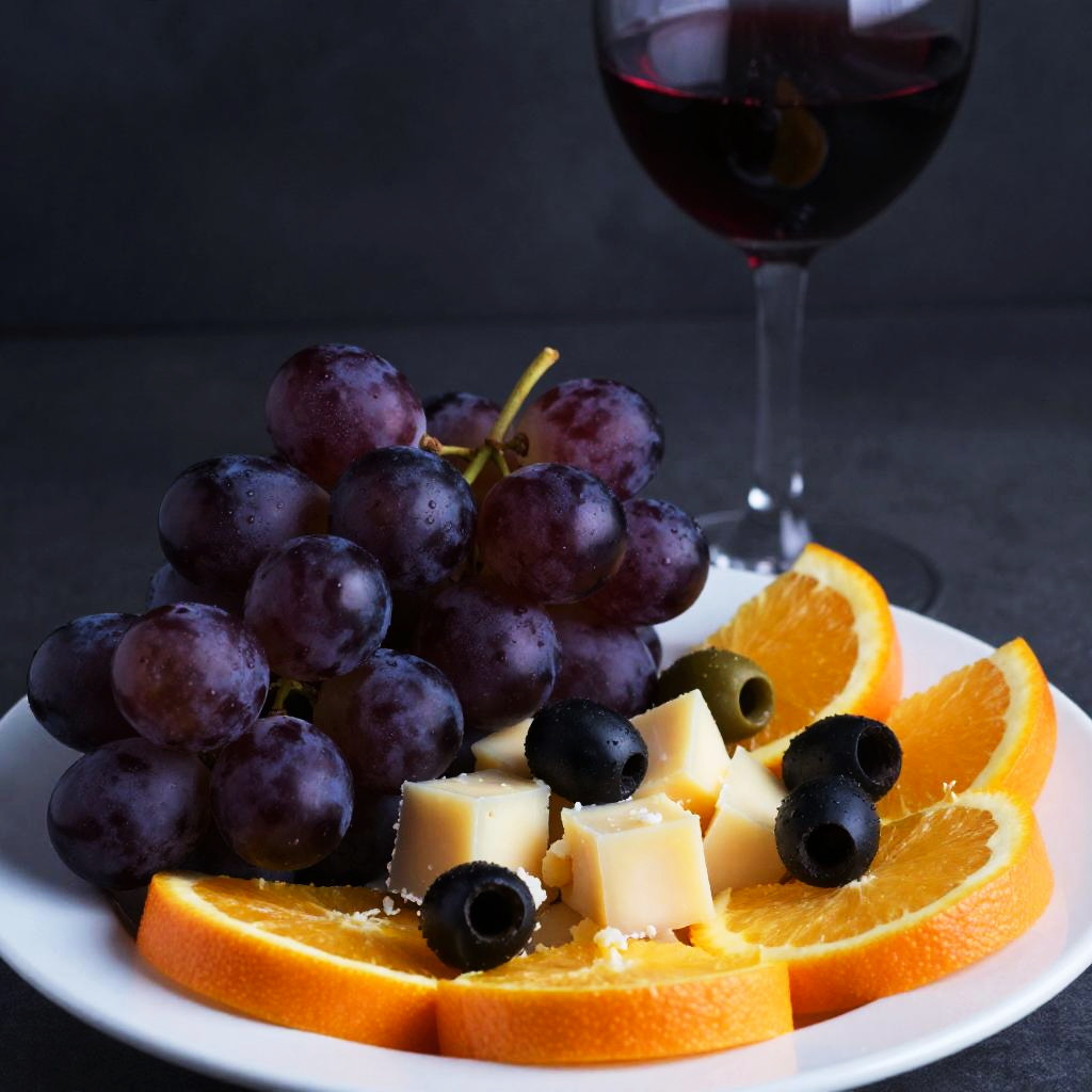 A close-up photo of a colorful snack arrangement on a white plate. It includes a pile of plump, dark purple grapes, orange slices, and chunks of creamy cheese with black and green olives scattered on top. A shiny, full glass of red wine stands in the background, slightly out of focus. The dark background makes the food and wine pop.