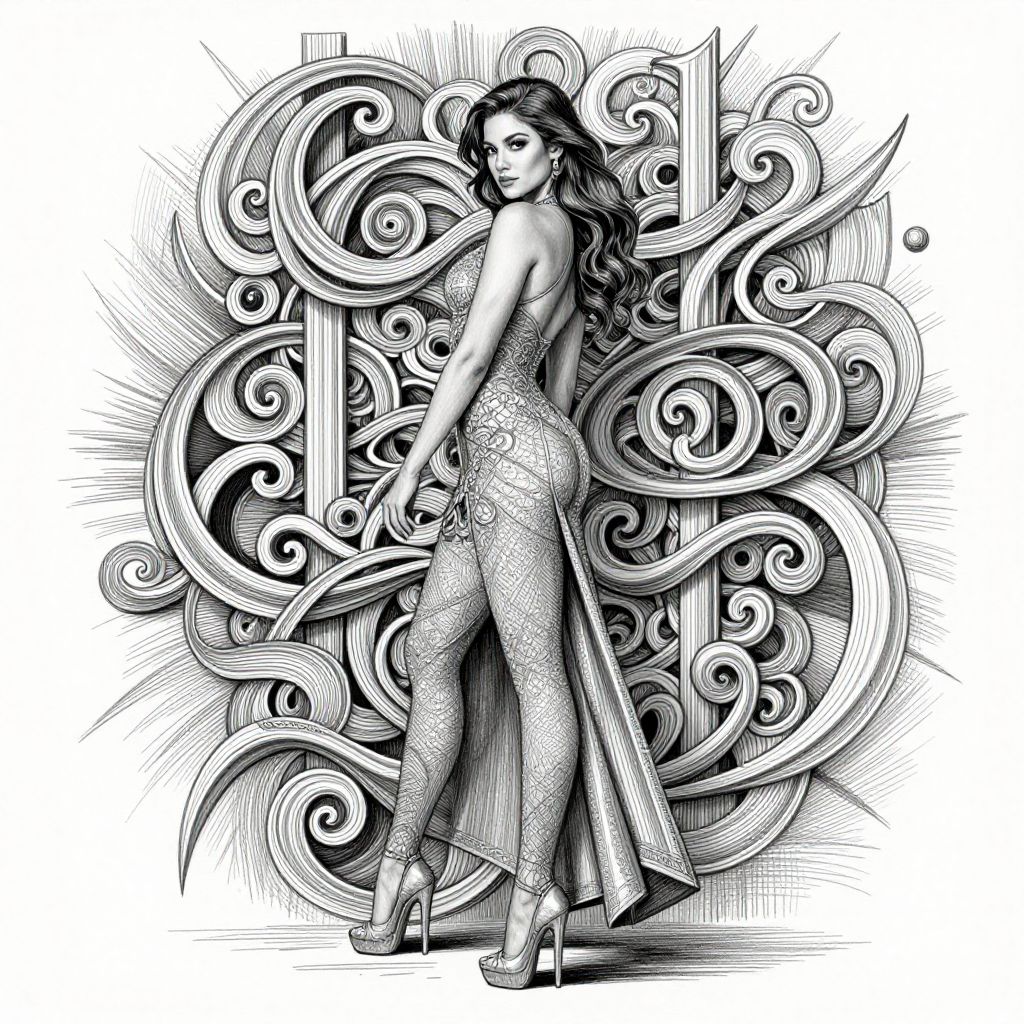 Black-and-white digital drawing of a curvy woman with long, wavy hair, standing in profile. She wears a form-fitting, textured dress with a long slit that reveals her toned legs. She stands in high-heeled shoes, looking over her shoulder with a confident expression. The background features intricate, swirling patterns with bold lines and shading, creating a dynamic, ornate backdrop. The woman's dress is adorned with a subtle, patterned texture, contrasting with the smooth, flowing lines of her hair and the elaborate background. The style is reminiscent of modern, graphic art with a strong emphasis on contrast and texture.