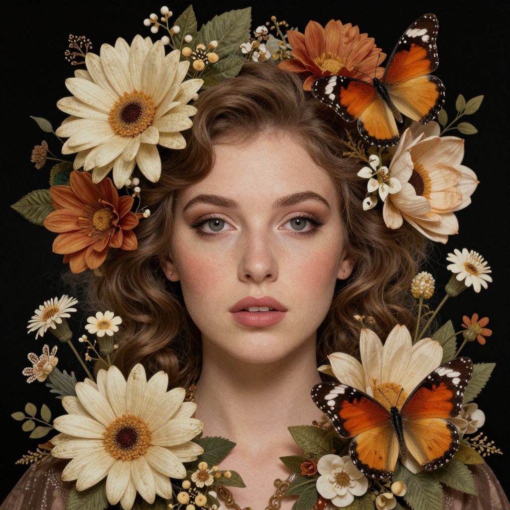 Photorealistic digital portrait of a fair-skinned, blue-eyed young woman with wavy brown hair, framed by an array of vibrant flowers and butterflies. The flowers include large white daisies, orange and brown blossoms, and small white daisies, while the butterflies are orange with black edges. Her expression is neutral, with slightly parted lips. The background is solid black, making the colorful floral arrangement stand out. She wears a brown garment, visible at the shoulders. The image has a soft, painterly texture, blending realistic and whimsical elements seamlessly.