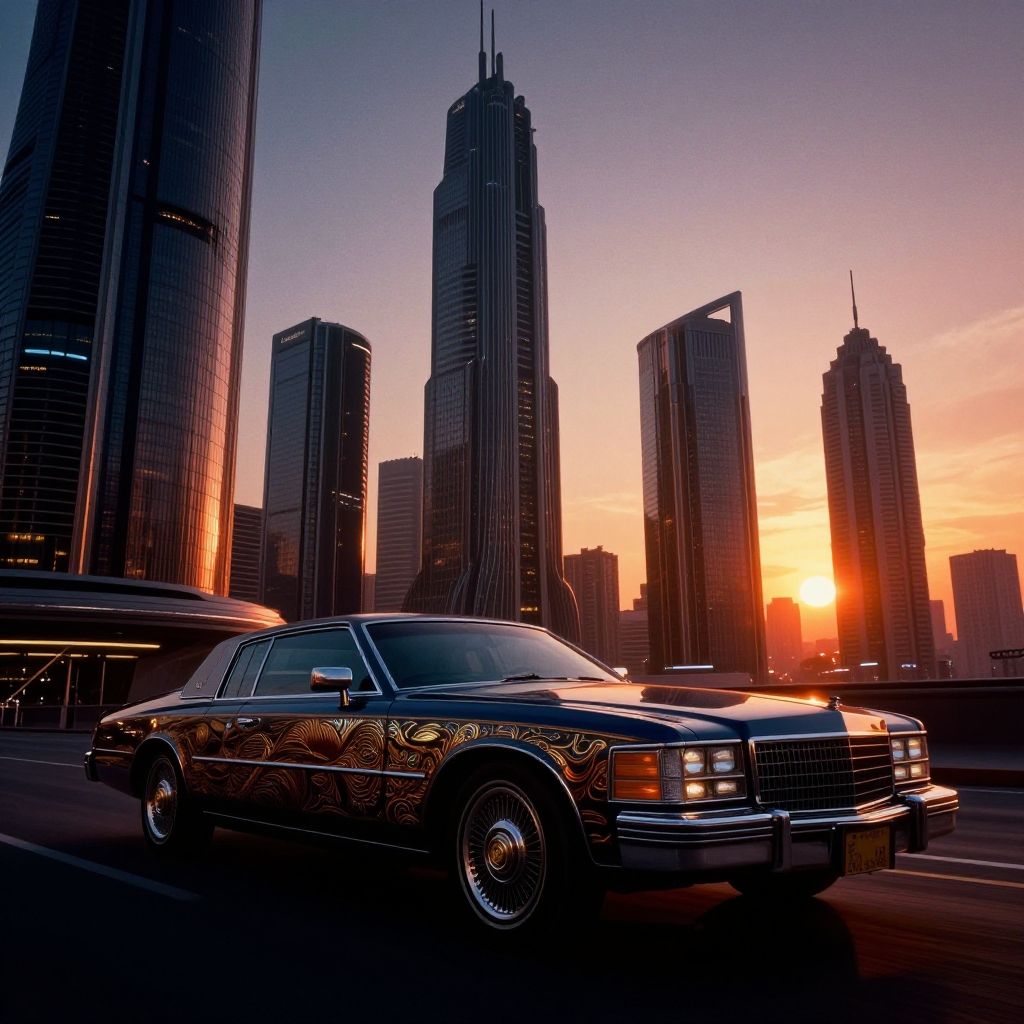 Cinematic still portrait of a Space Cadillac, futuristic skyscrapers, same dark light, Blade Runner, future 2050, in "Rick Deckard", Futuristic Architecture Designs, buildings of the future, in the sunset . emotional, harmonious, vignette, 4k epic detailed, shot on kodak, 35mm photo, sharp focus, high budget, cinemascope, moody, epic, gorgeous, film grain, grainy, Ornate and Intricate, portrait of a Space Cadillac, in the sunset, decorative, highly detailed, elaborate, ornate, intricate, strong, dynamic dramatic cinematic color, ambient detailed, bright, rich deep colors, creative, positive, emotional, shiny, beautiful