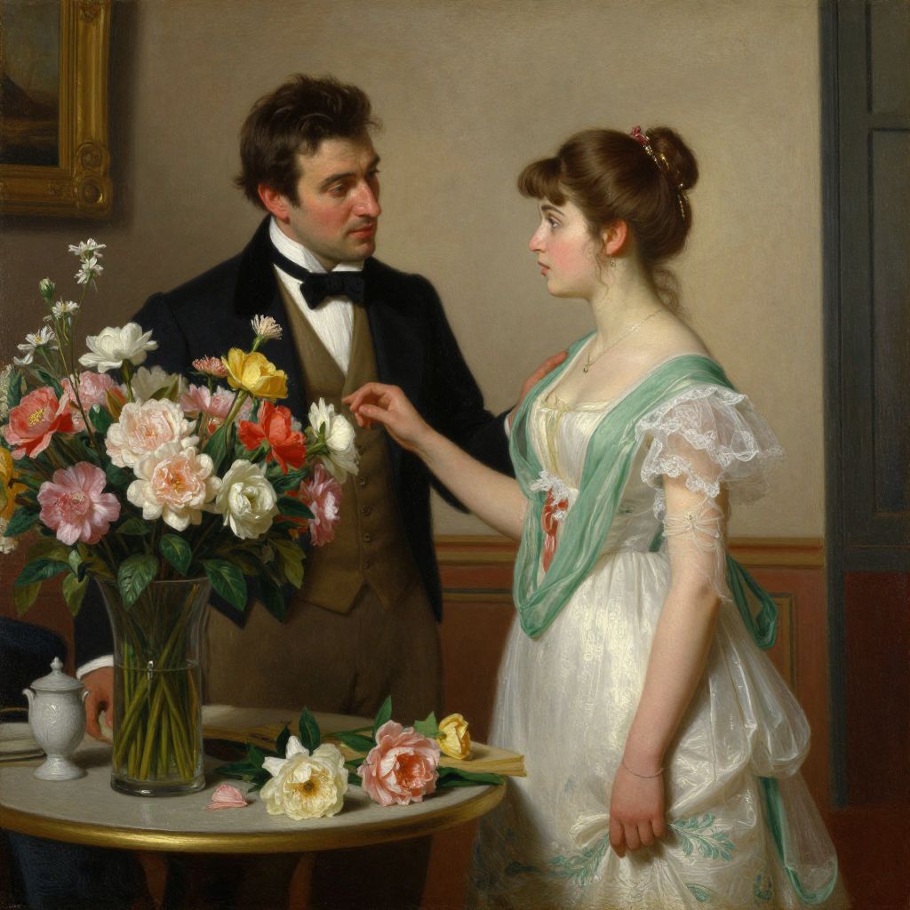 Victor-Gabriel Gilbert's oil painting, \"The Flower Seller,\" captures a tender moment between a formally dressed gentleman and a young woman adorned in a delicate white dress with green accents, set against a warmly lit interior featuring a table laden with vibrant flowers, showcasing the artist's meticulous attention to detail and classical realism.