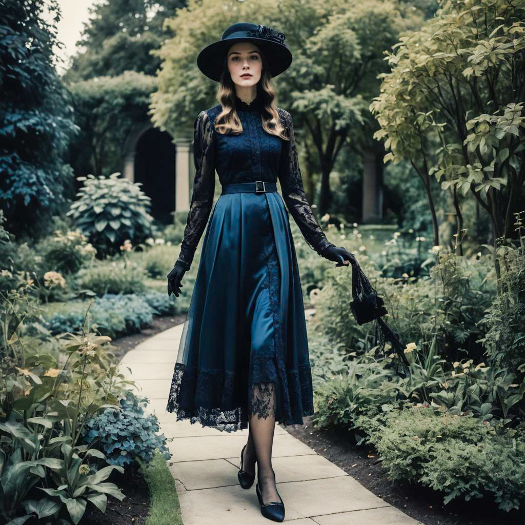 Photo of a Long Legs woman, Straight Long, funeral outfit, black lace details, Prussian Blue Silk, ballet flats, black hat, Elegantly arranged garden, vintage film grain