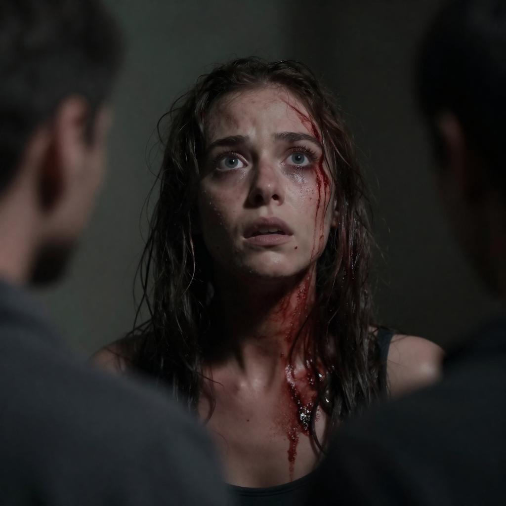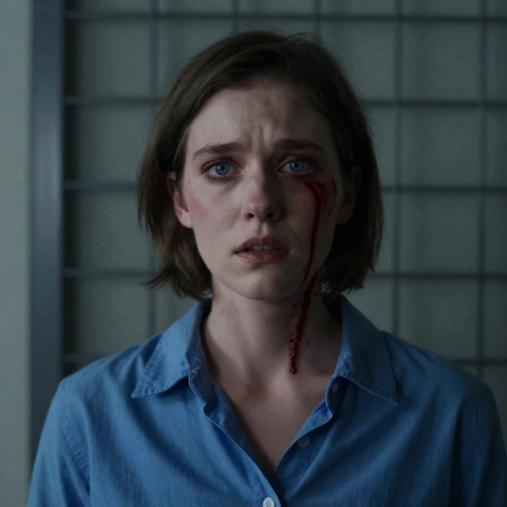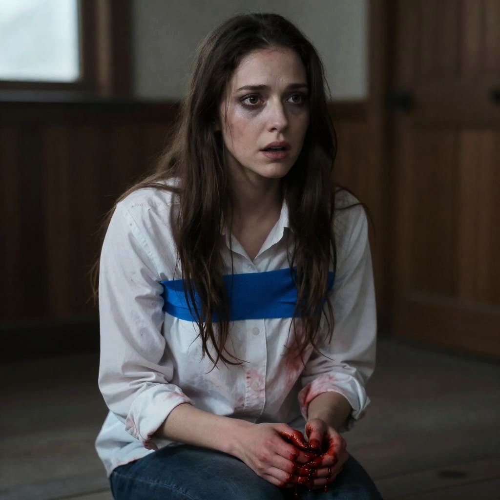 Photograph of a woman with long brown hair, blood-stained white shirt, and blue bandage on chest. She kneels, hands clasped, blood dripping from fingers. Background shows blurred wooden wall and window. Her face is pale, eyes wide, mouth slightly open.