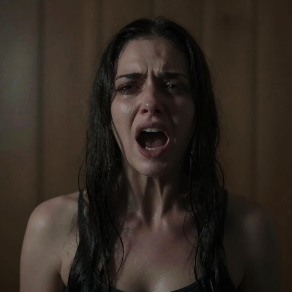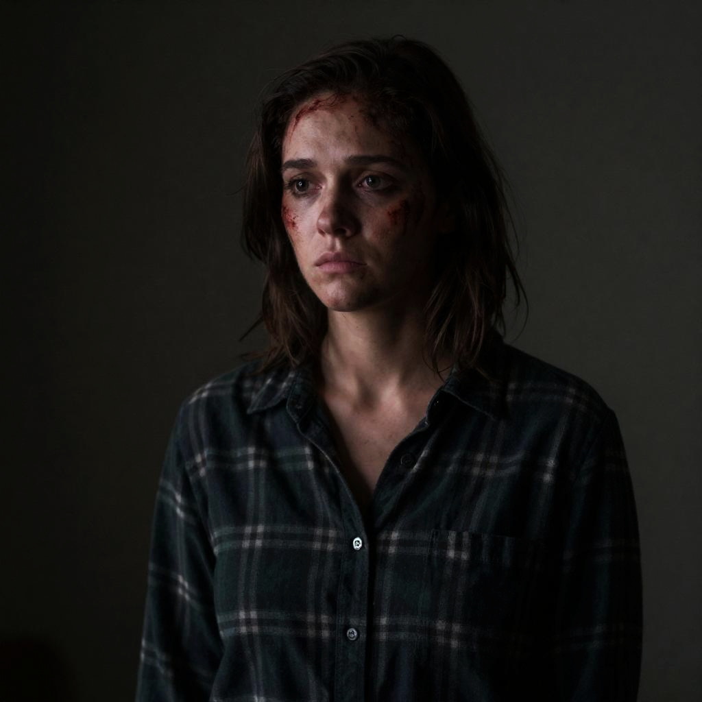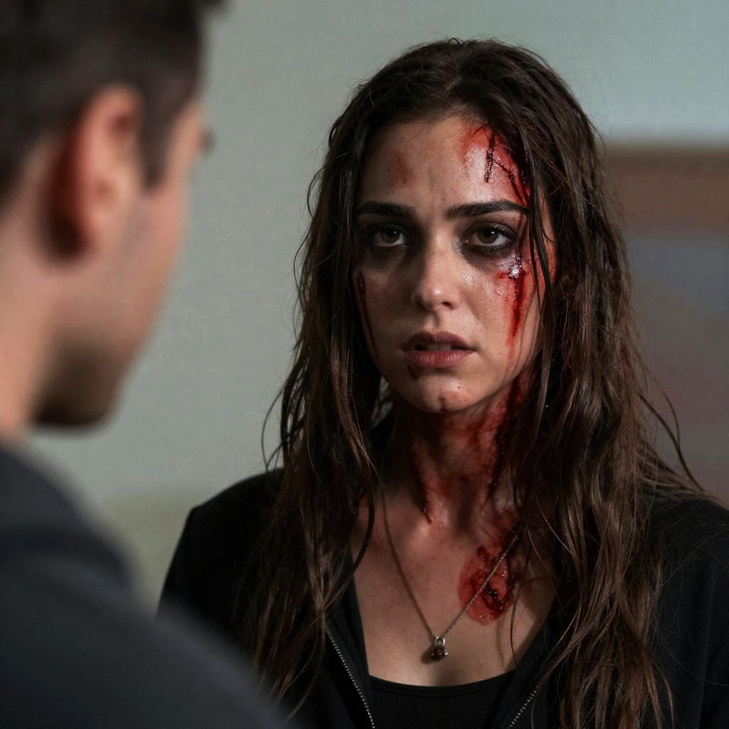 Photograph of a woman with long brown hair, blood-stained white shirt, and blue bandage on chest. She kneels, hands clasped, blood dripping from fingers. Background shows blurred wooden wall and window. Her face is pale, eyes wide, mouth slightly open.