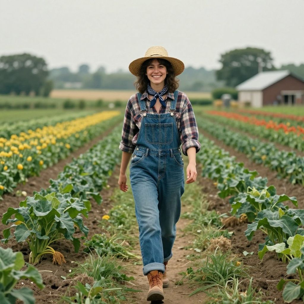 MichelleD_SoloTI_v1, PA7_Portrait-MCU, (happy, smile:1.3), (Dressed in a cozy plaid shirt paired with durable denim overalls and practical work boots, adorned with a straw hat and a bandana tied around her neck), (Strolling through a charming countryside farmstead, with rows of vibrant crops stretching toward the horizon and the soothing sounds of nature enveloping the air, where every corner whispers tales of hard work and harvest: 1.3) (seductive:1.3), (analog, cinematic, film grain, hazy atmosphere, cinematic shot:1.3)
