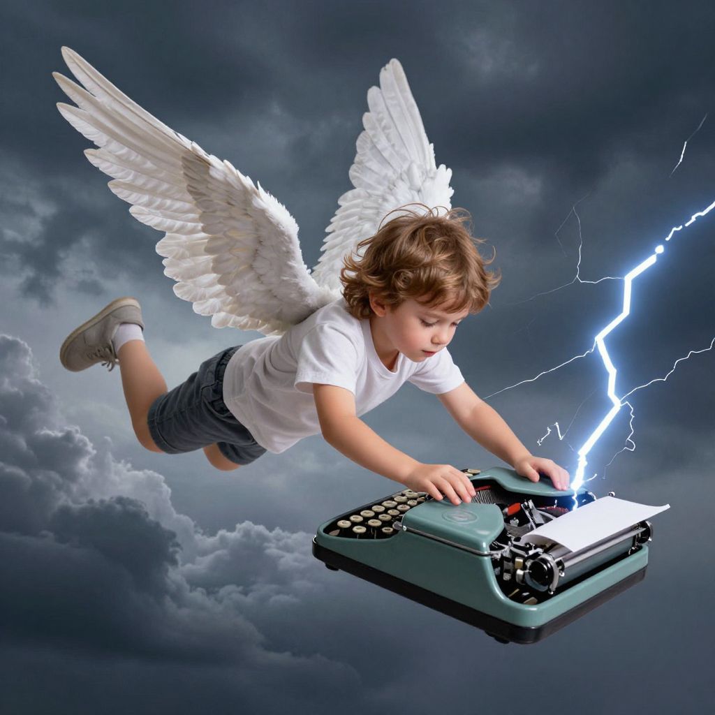 Digital artwork of a winged, brown-haired child in a white shirt and gray shorts, flying over stormy clouds, typing on a floating typewriter