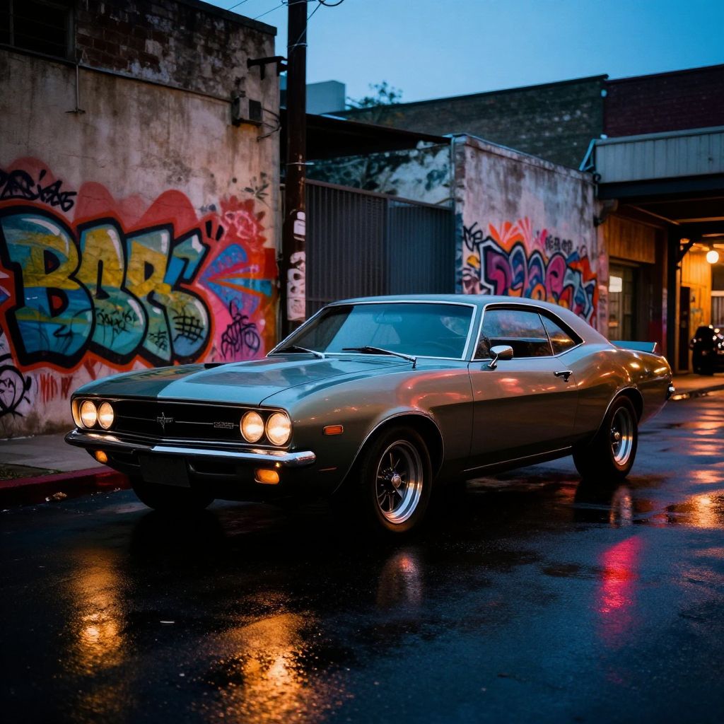 GTA filter applied to a vintage muscle car parked in an urban alley, graffiti on the walls, wet pavement reflecting colorful lights, dusk environment, high contrast, gritty textures, sharp shadows, cinematic and highly stylized urban art.