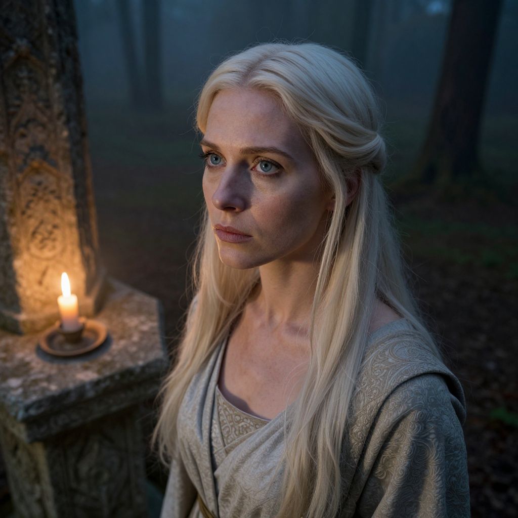 Imagine a portrait of a stoic European woman in her mid-thirties, exuding an air of ancient wisdom and silent strength. Her piercing blue eyes and long, straight platinum blonde hair frame her face, while the soft glow of candlelight from an ancient stone altar illuminates her features. Standing amidst a misty forest clearing at twilight, intricate shadows dance across her strong jawline and high cheekbones. Captured in a unique bird's-eye view perspective, she gazes into the distance with an expression that conveys both determination and melancholy, evoking an emotional depth that resonates deeply.