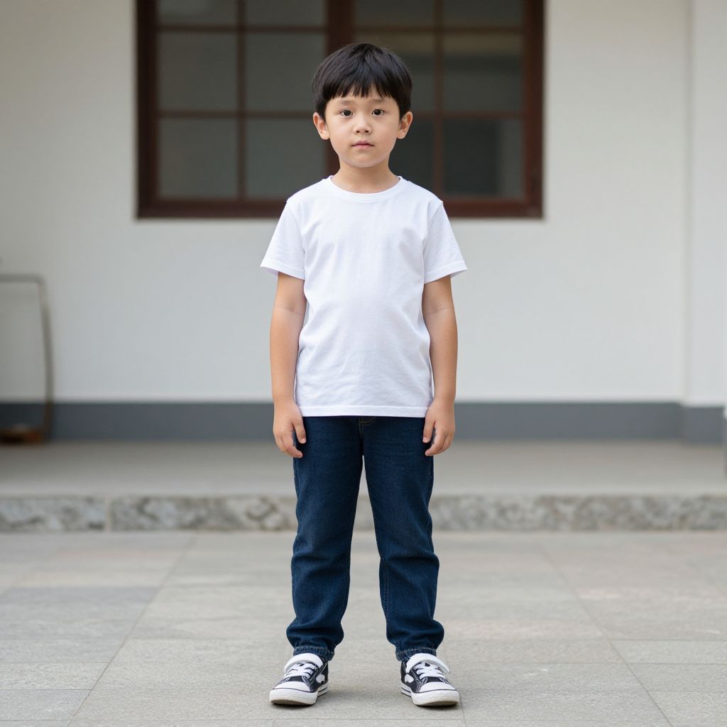 Photograph of a young Asian boy standing in an outdoor area. He has short black hair, fair skin, and a serious expression. He wears a plain white t-shirt, dark blue jeans, and black-and-white sneakers. The background features a white wall with a large, dark-framed window, and a gray tiled floor with a stone border. The boy is centered in the image, with his arms relaxed at his sides. The lighting is natural, highlighting his simple, casual attire.