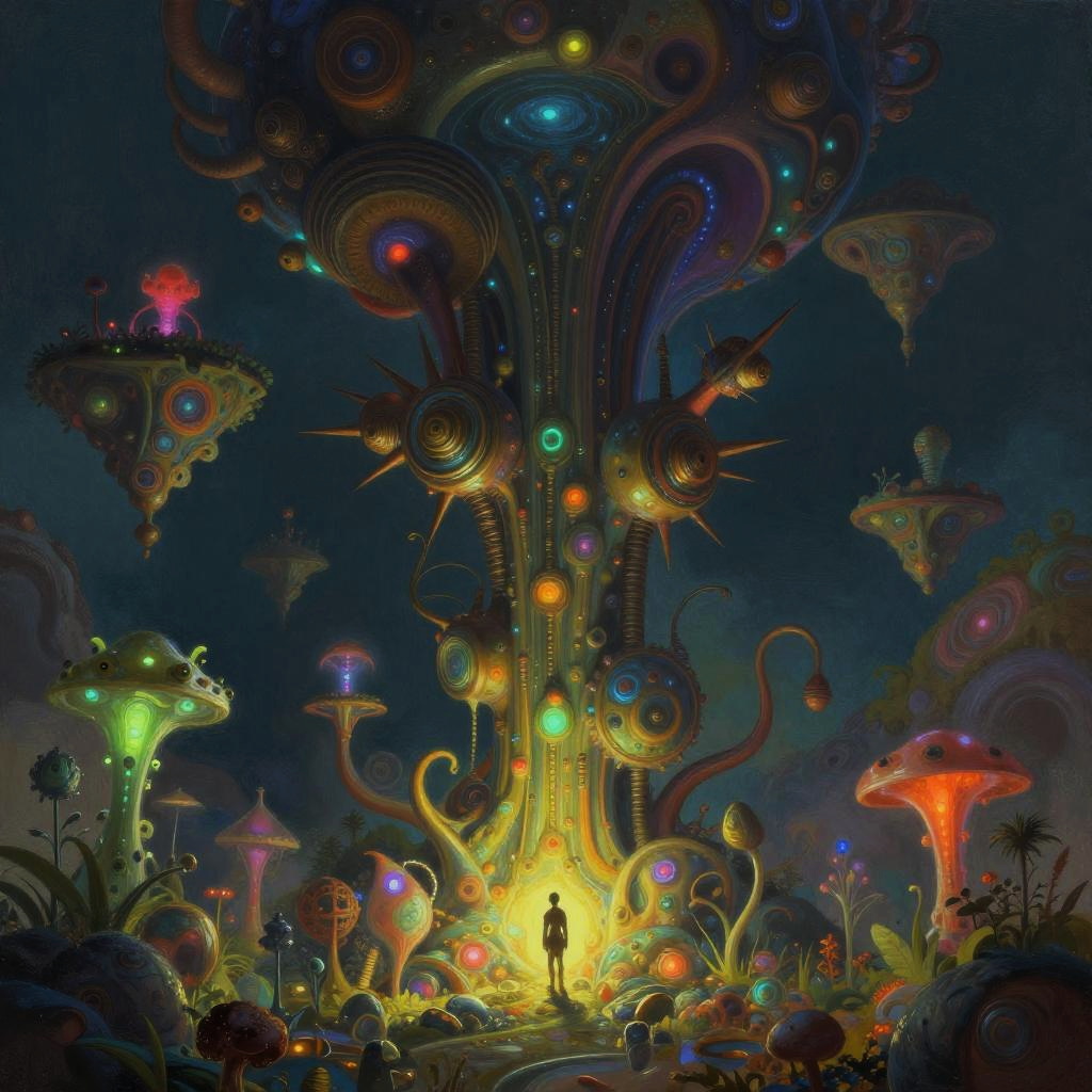 This is a digital fantasy artwork depicting a whimsical floating island adorned with vibrant, surreal flora and luminescent orbs. The central structure resembles a twisted, organic tower with glowing blue and purple windows. Surrounding it are colorful mushrooms, glowing orbs, and exotic plants. Other smaller, similarly adorned floating islands are scattered in the misty, ethereal background. The palette includes rich greens, purples, blues, and oranges, with intricate, swirling patterns and textures enhancing the fantastical feel. The scene is illuminated by soft, magical light, creating a dreamlike atmosphere.