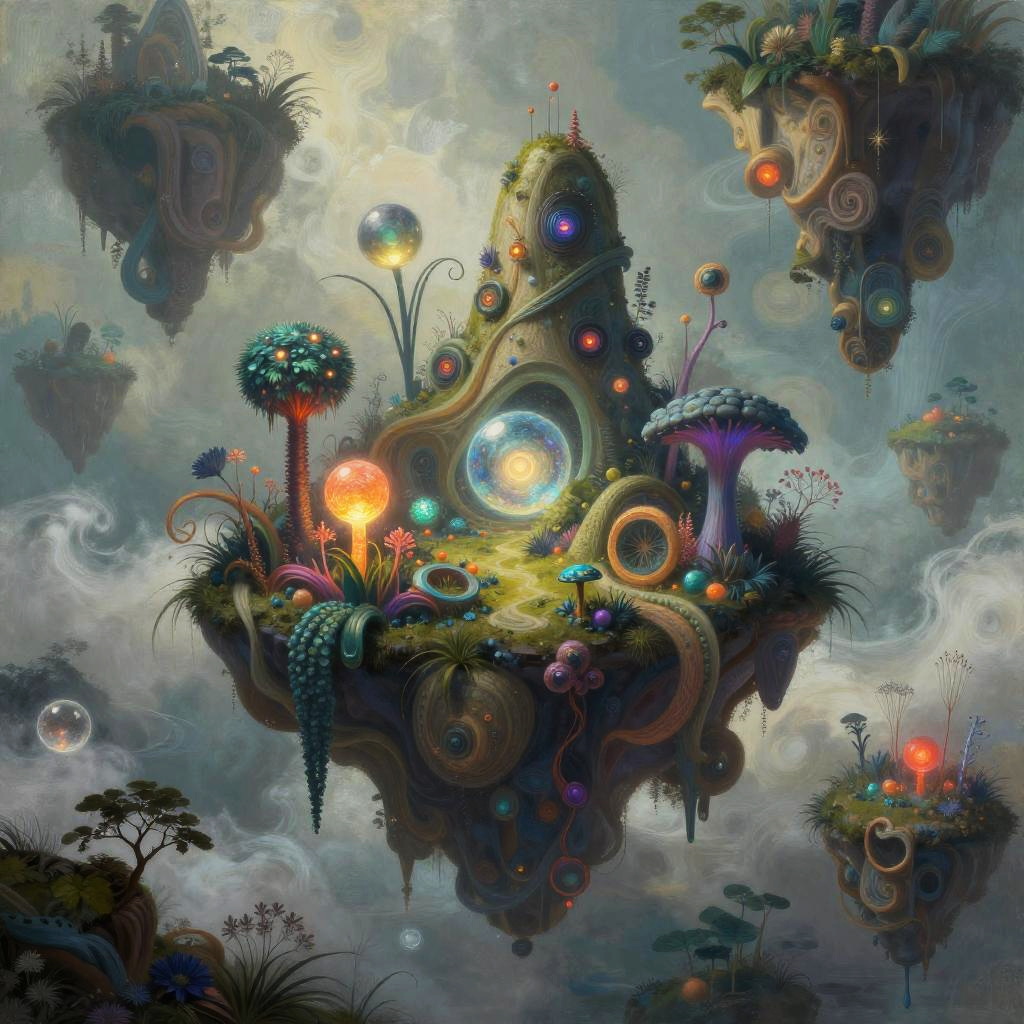 Fantastical digital painting of whimsical floating islands adorned with vibrant, glowing plants and surreal, colorful structures in a dreamy, cloudy sky.