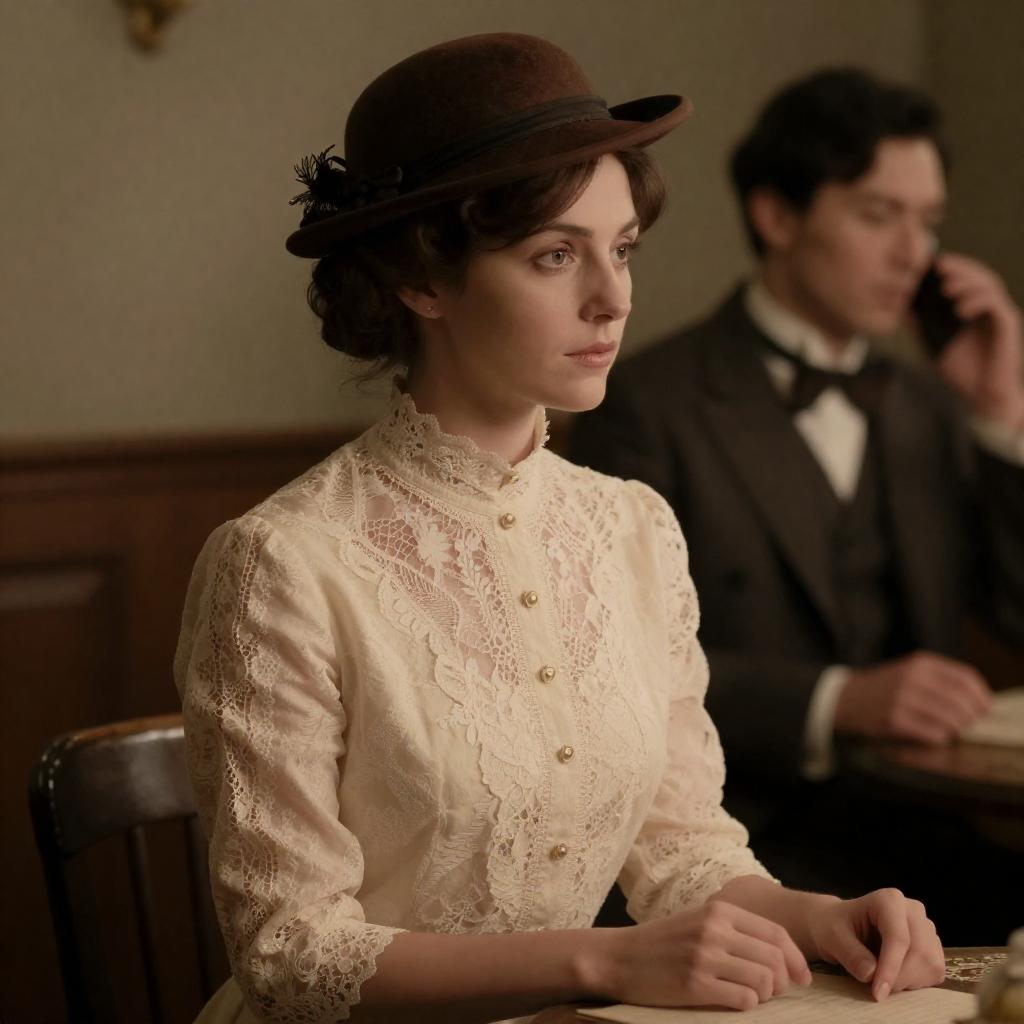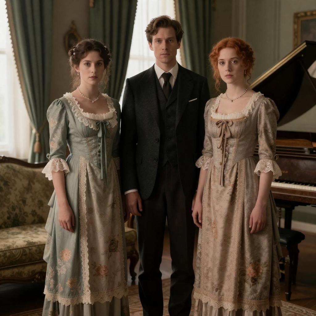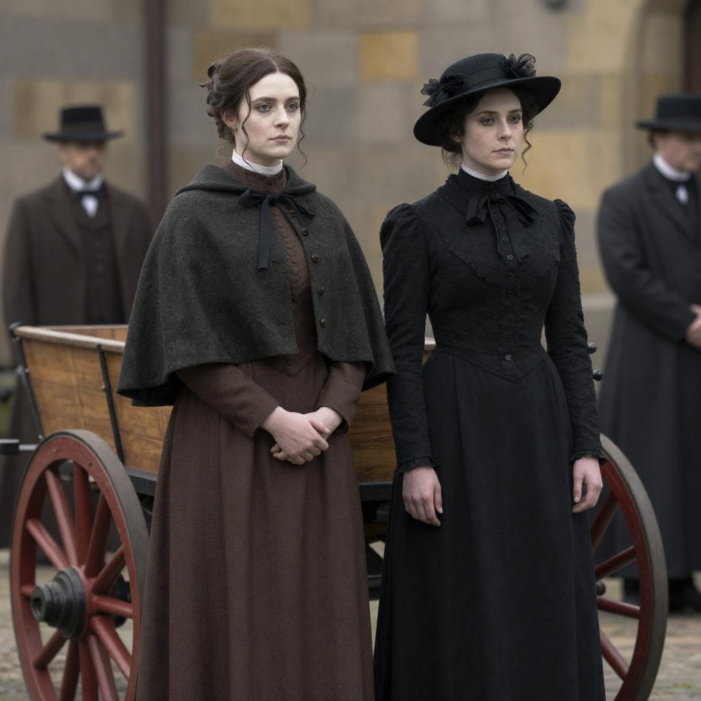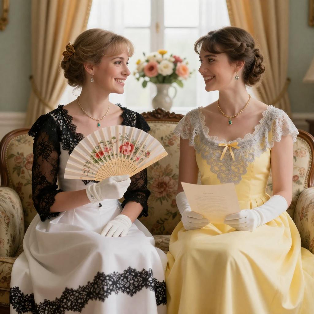Two women in Victorian-style dresses, seated on a floral-patterned couch. One wears a black dress, the other a green and black patterned dress with white cuffs. Both have brown hair, fair skin, and neutral expressions. Background includes a wooden cabinet, framed picture, and a glass lamp on a side table.