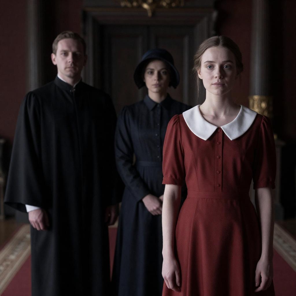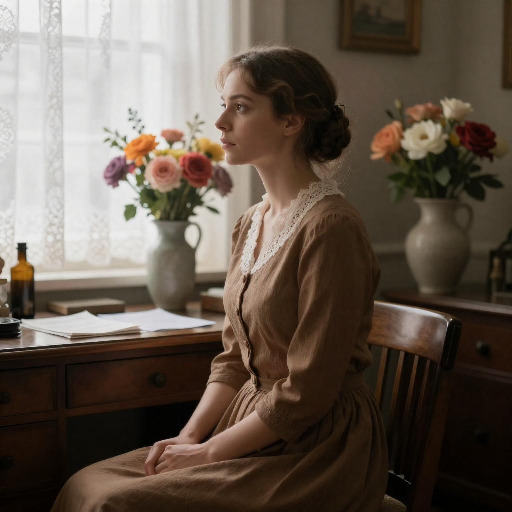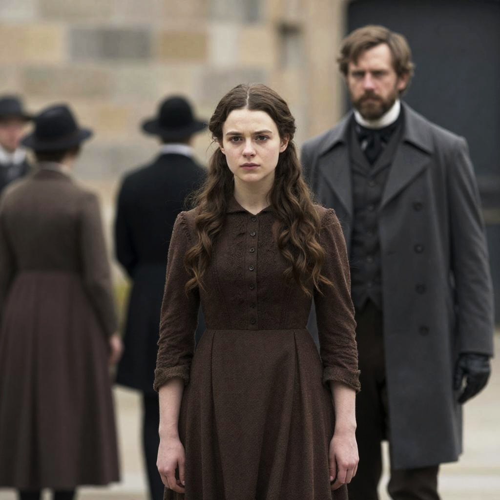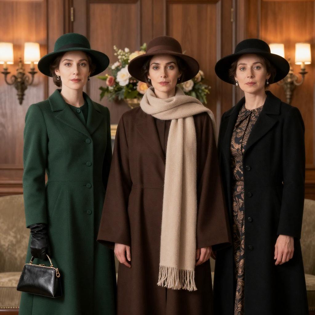 Two women in Victorian-style dresses, seated on a floral-patterned couch. One wears a black dress, the other a green and black patterned dress with white cuffs. Both have brown hair, fair skin, and neutral expressions. Background includes a wooden cabinet, framed picture, and a glass lamp on a side table.