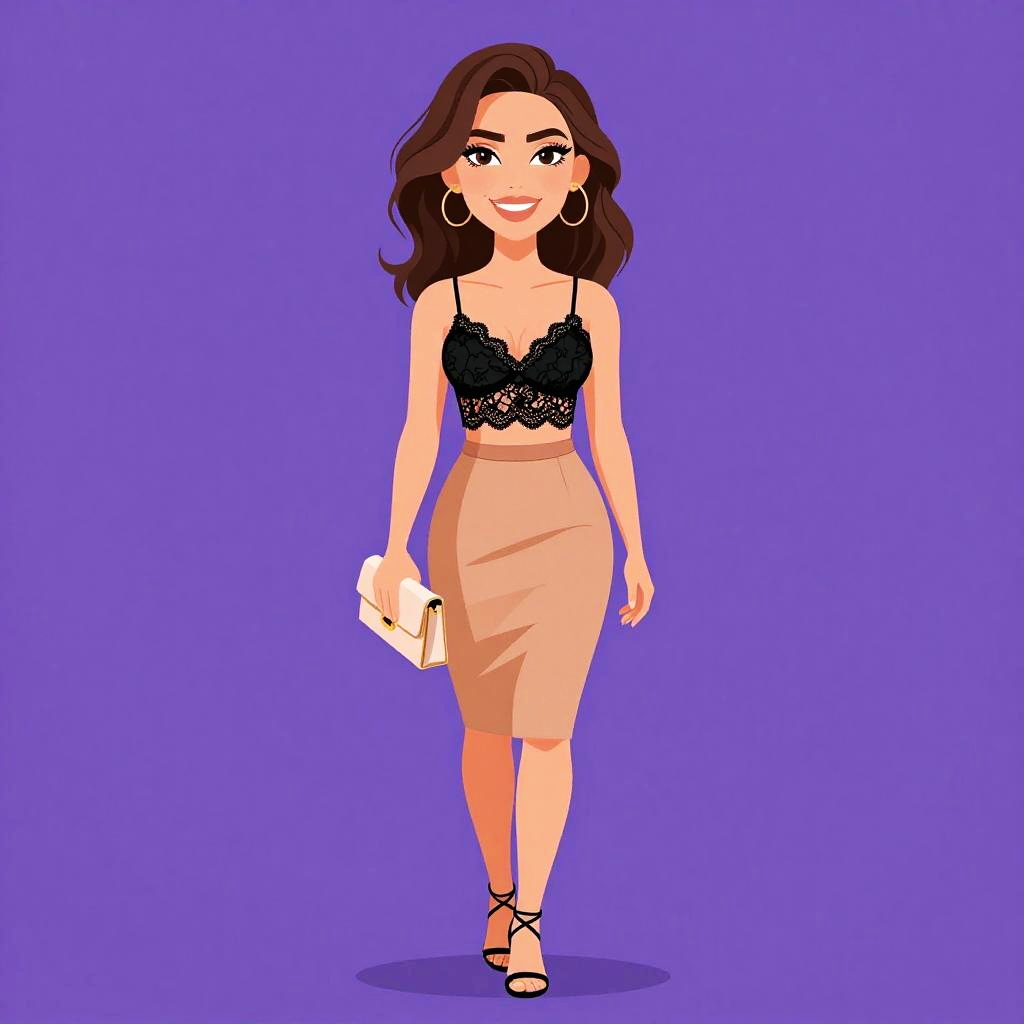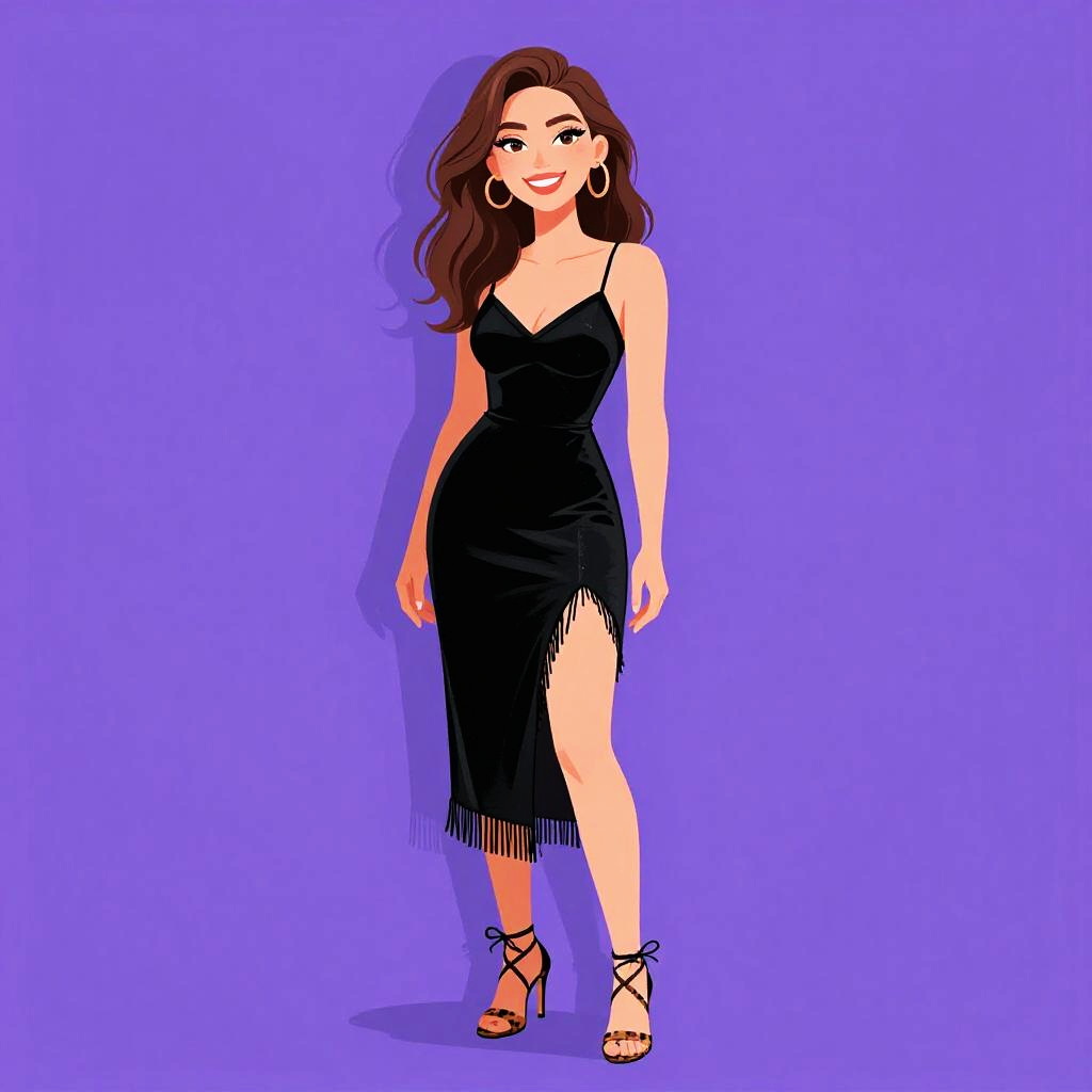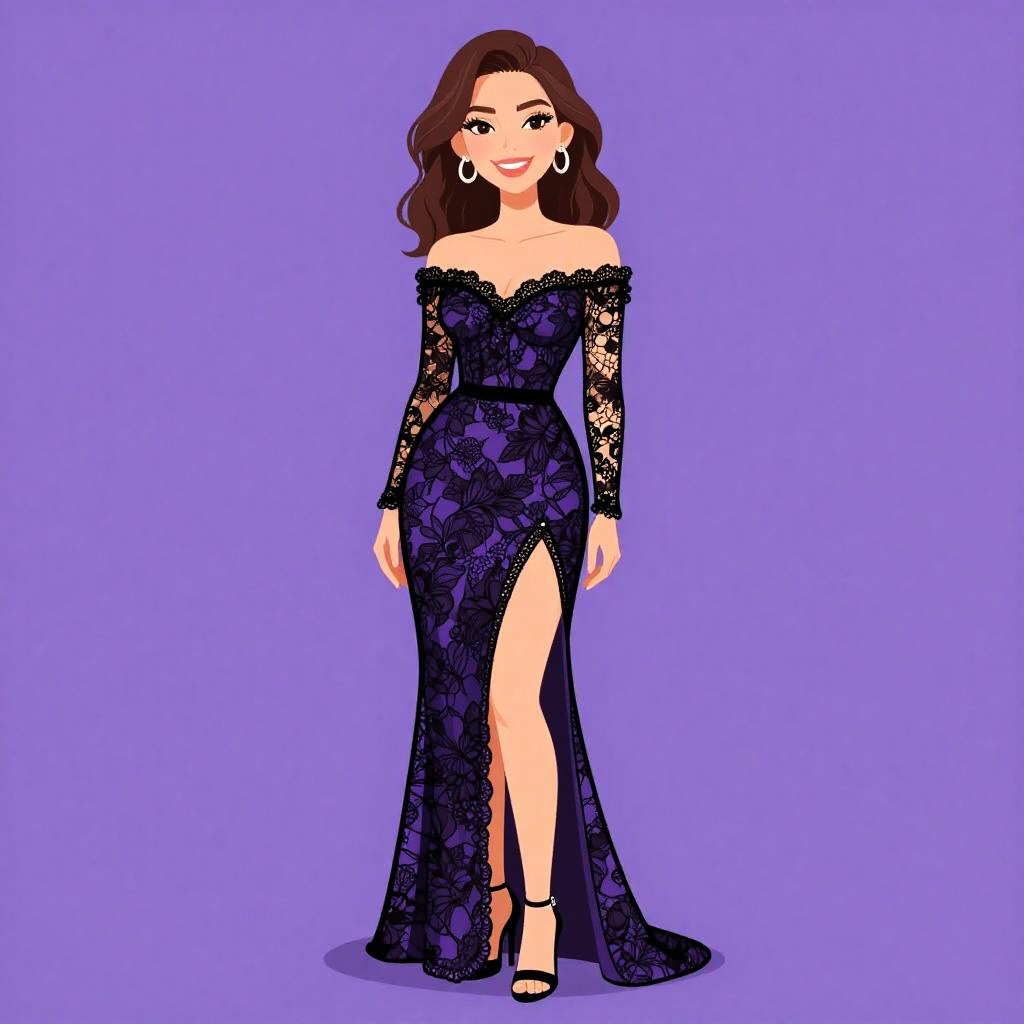 Woman with pretty face and pretty hair. Woman, evening wear, black lace dress with a floral pattern, V-neckline, sleeveless, fitted silhouette, scalloped hemline finishing mid-thigh, paired with sheer black tights and black lace-up knee-high boots with a stiletto heel. --sref 1467