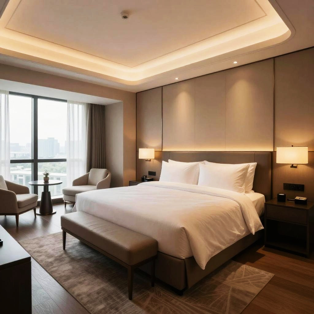 Photorealistic modern hotel room featuring a large king-size bed with white linens, a padded bench at the foot of the bed, soft ambient ceiling lighting, and earth-toned walls. The room includes two upholstered armchairs and a small round table near a large window with sheer curtains, offering a cityscape view. The design reflects understated sophistication with warm, neutral colors and sleek furniture.