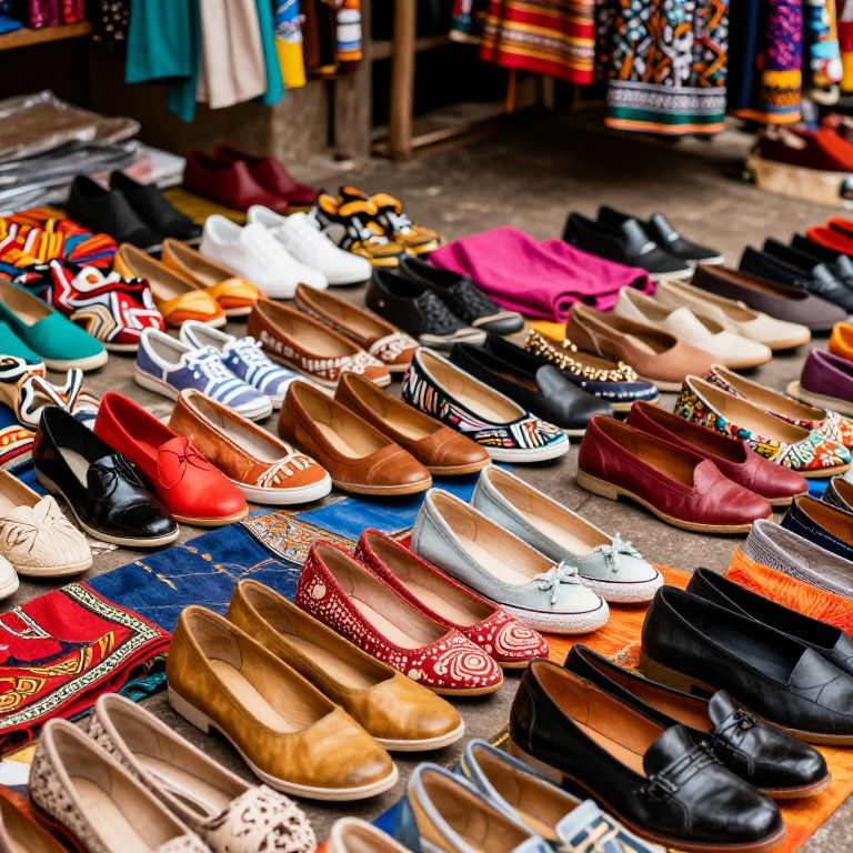 Photograph of a vibrant outdoor market stall displaying a colorful array of diverse shoes, including flats, loafers, sandals, and boots, with textiles in