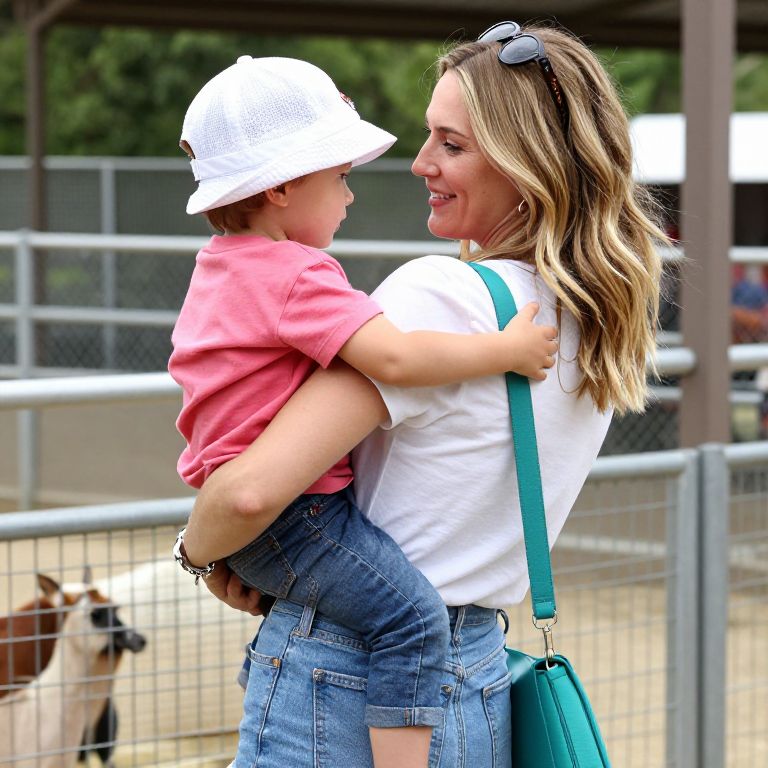 Selma Blair carries her son Arthur, dressed in a pink shirt and white hat, as they visit a petting zoo, with a teal crossbody bag slung over her shoulder and a chain-link fence visible in the background.