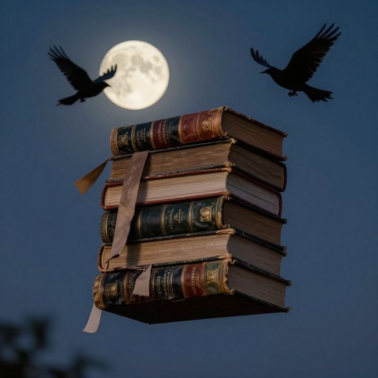 Stacked ancient tomes hover serenely amidst a starlit sky, their weathered spines adorned with dangling ribbons, illuminated softly by the radiant full moon and crescent above, while two silhouetted birds glide gracefully nearby.