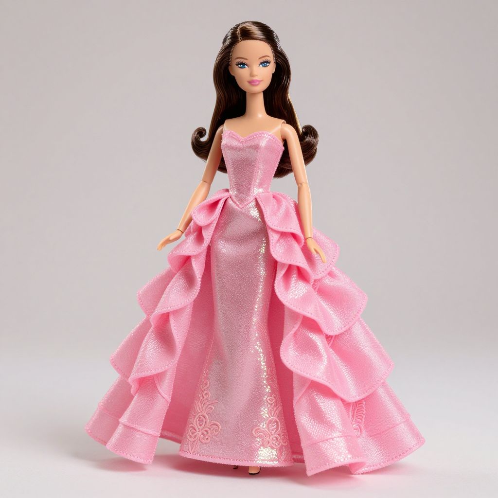 Barbie doll elegantly posed in a shimmering pink gown with cascading ruffles, showcasing intricate details and a radiant evening dress against a neutral backdrop.