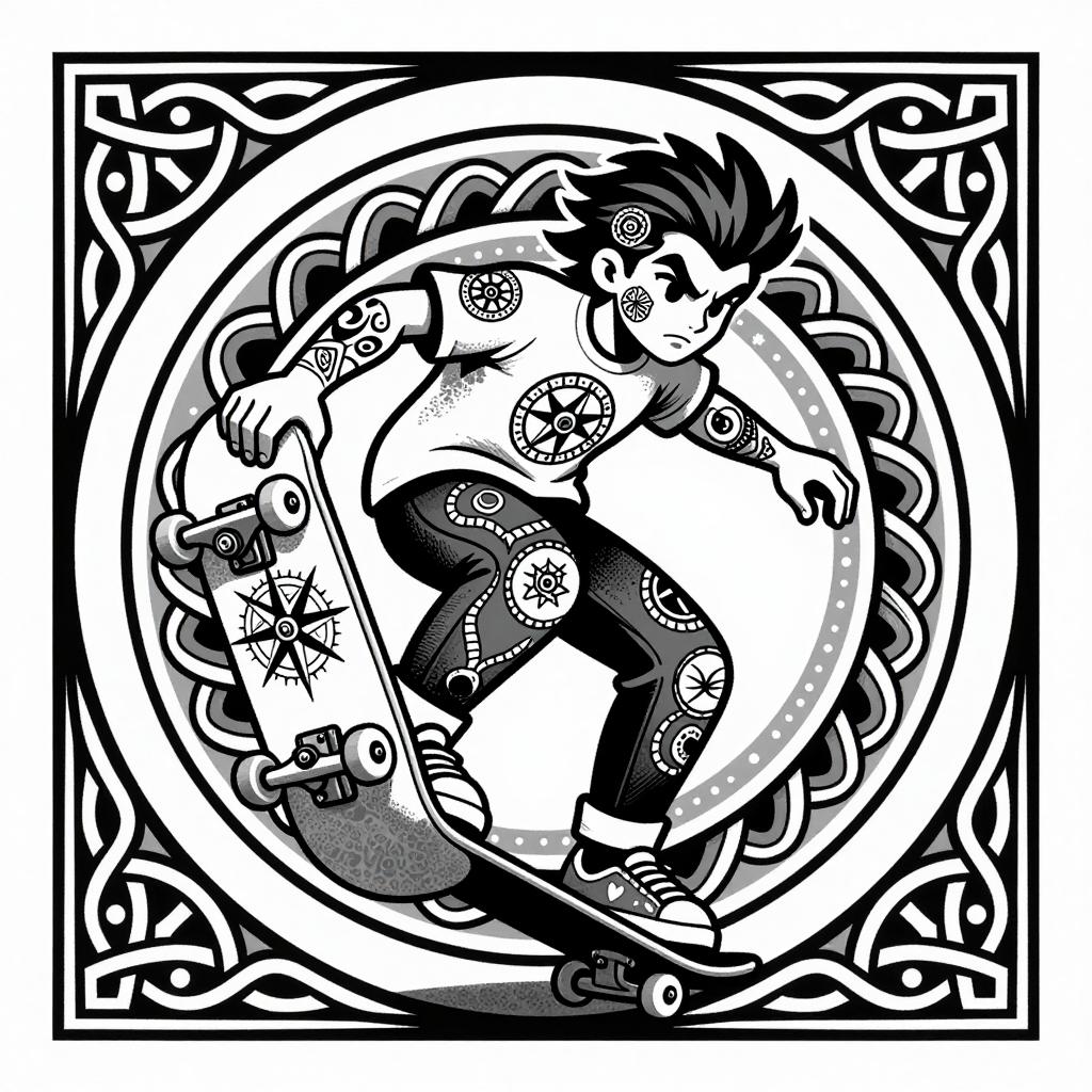 Monochrome tattoo-style illustration of a skateboarder holding a skateboard deck featuring a compass design. The artwork is inspired by lithograph techniques, blending surrealism with dynamic character design and intricate patterns. The skateboarder is depicted with detailed tattoos and stylized hair, framed by swirling, multilayered circular motifs and a decorative border reminiscent of Celtic knots.