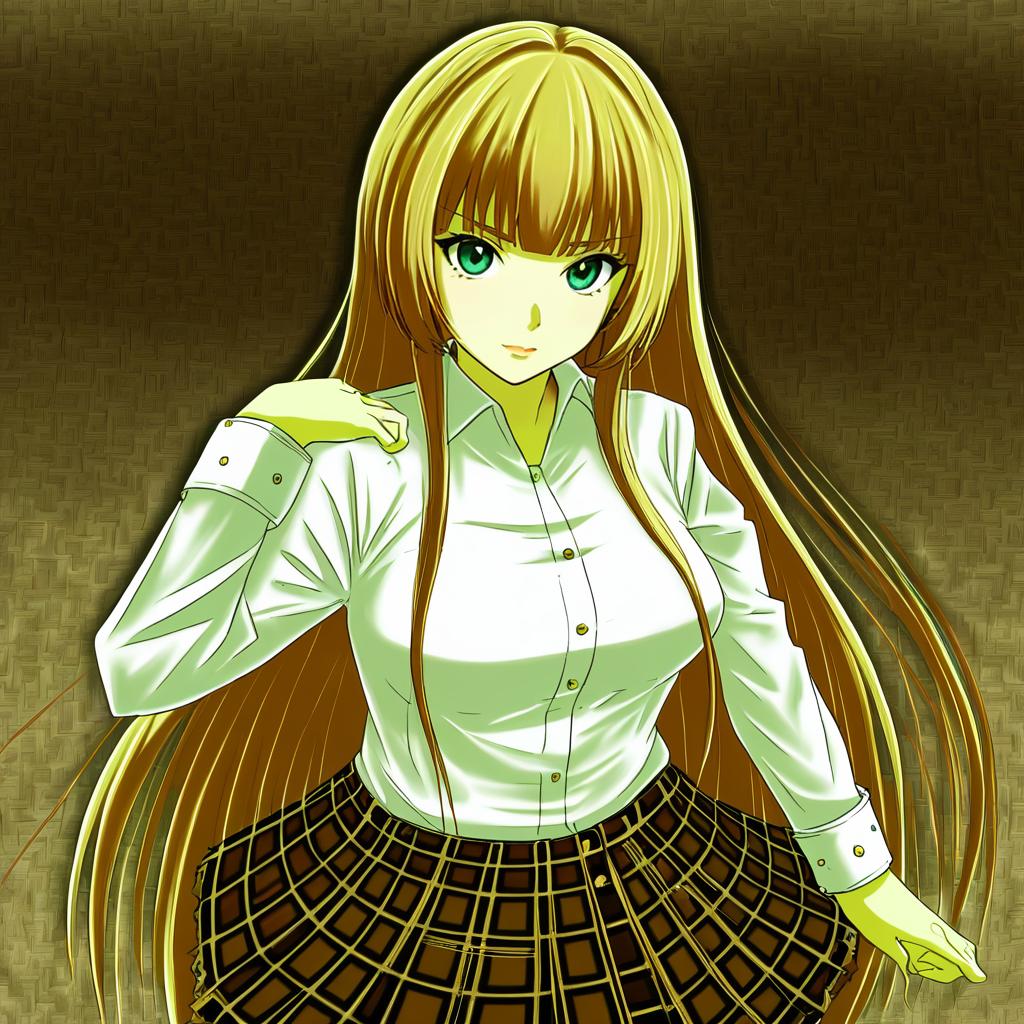 Illustration of an anime-style girl with very long blonde hair, green eyes, and blunt bangs. She is wearing a white long-sleeve shirt with ruffle details and a plaid brown skirt. The character also has black thigh-high stockings and a blue ribbon around her collar. The artwork features a neutral gray background.