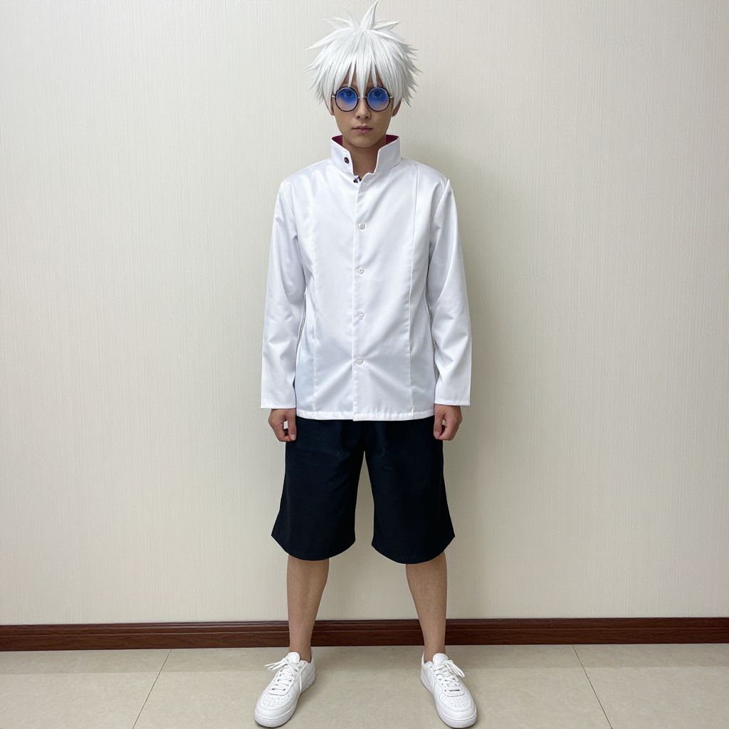 Photograph of a young person with spiky white hair and blue reflective sunglasses, standing against a plain white wall with a wooden baseboard. They wear a long-sleeved white shirt, black knee-length shorts, and white sneakers. The background is minimalistic, with a smooth, cream-colored floor that meets the wall. The person stands with a neutral expression, arms relaxed at their sides, creating a stark contrast between their white top and black shorts. The lighting is bright, highlighting the clean, simple aesthetic of the scene.