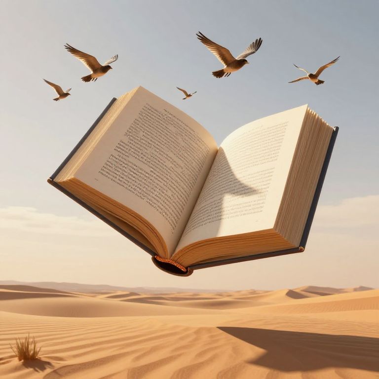 A surreal 3D-rendered scene depicts giant books floating midair amidst a flock of birds, their pages fluttering like wings as they cast ethereal shadows, symbolizing the transformative power of words against a desert landscape bathed in golden-hour light.