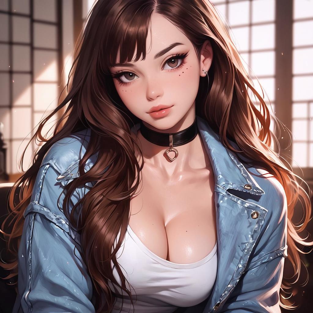 1girl, solo, long hair, brown hair, parted lips, lips, brown eyes, surrealism, sitting, indoors, traditional japanese room, looking at viewer, anatomy focus - breasts, cleavage, facial characteristics - lips, choker accessory, detailed clothing - denim jacket, setting accentuates mood, colorful strobe