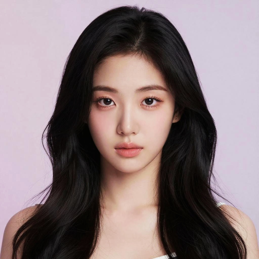 Kpop black hair with soft waves, pastel-themed studio backdrop, delicate makeup, elegant idol portrait in soft lighting, dreamy and ethereal, ultra-detailed hair strands