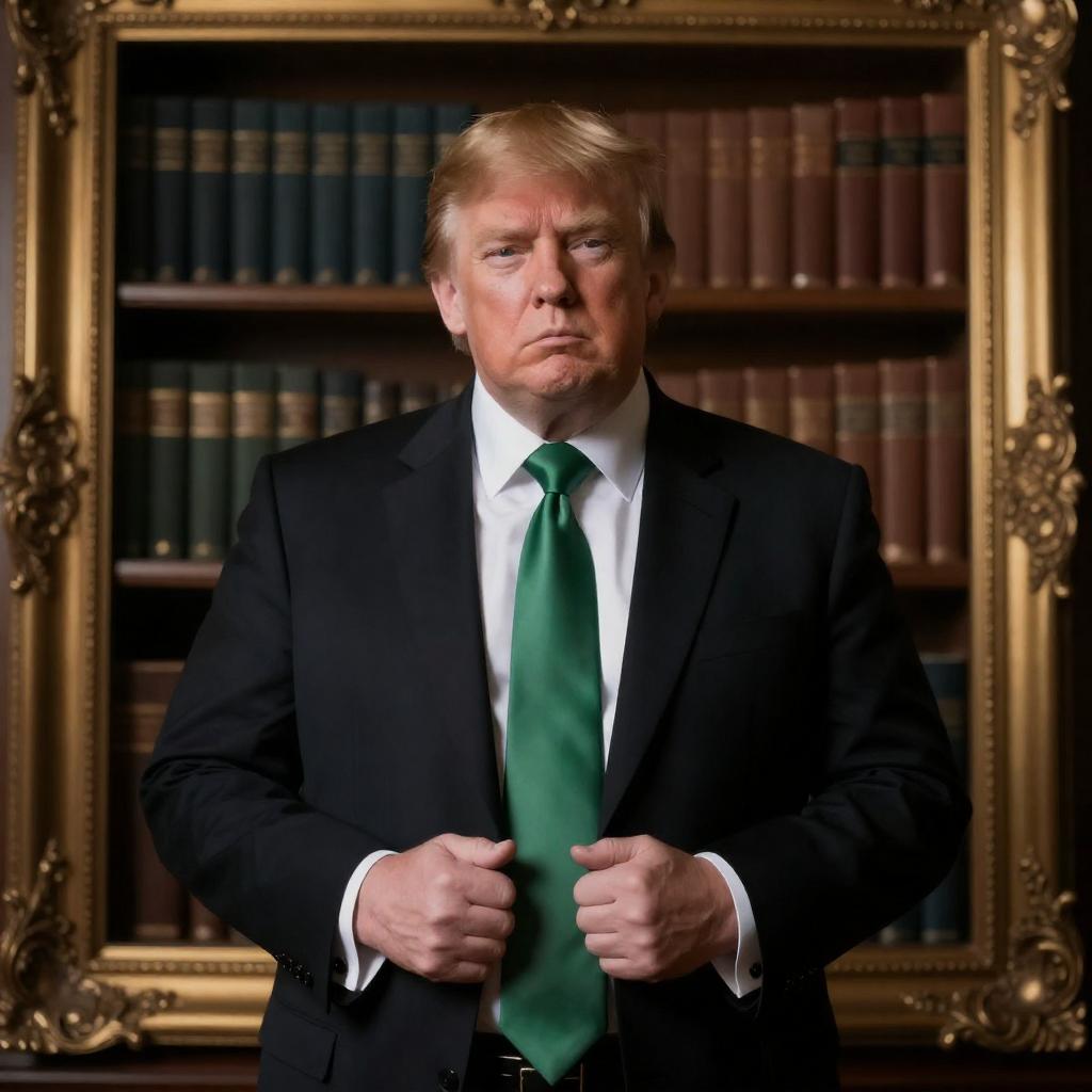 Realistic painting of a heavyset man with light skin, blond hair, and a stern expression, wearing a black suit with a white shirt and green tie, standing with hands gripping his jacket lapels. Ornate gold frame, dark bookshelf in background.